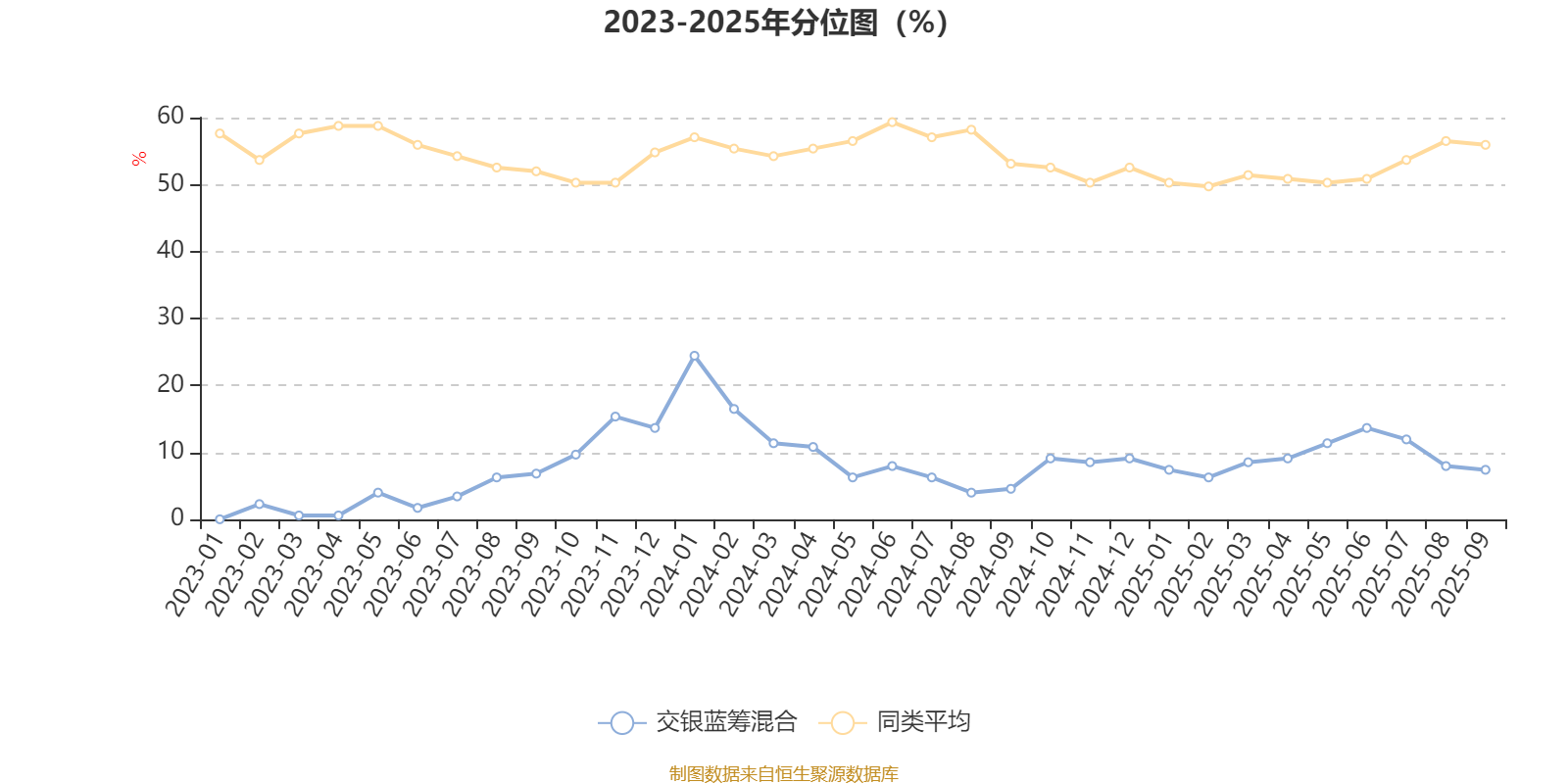 通过所选区间该基金净值增长率分位图,可以观察该基金与同类基金业绩比较情况。图为坐标原点到区间内某时点的净值增长率在同类基金中的分位数。
