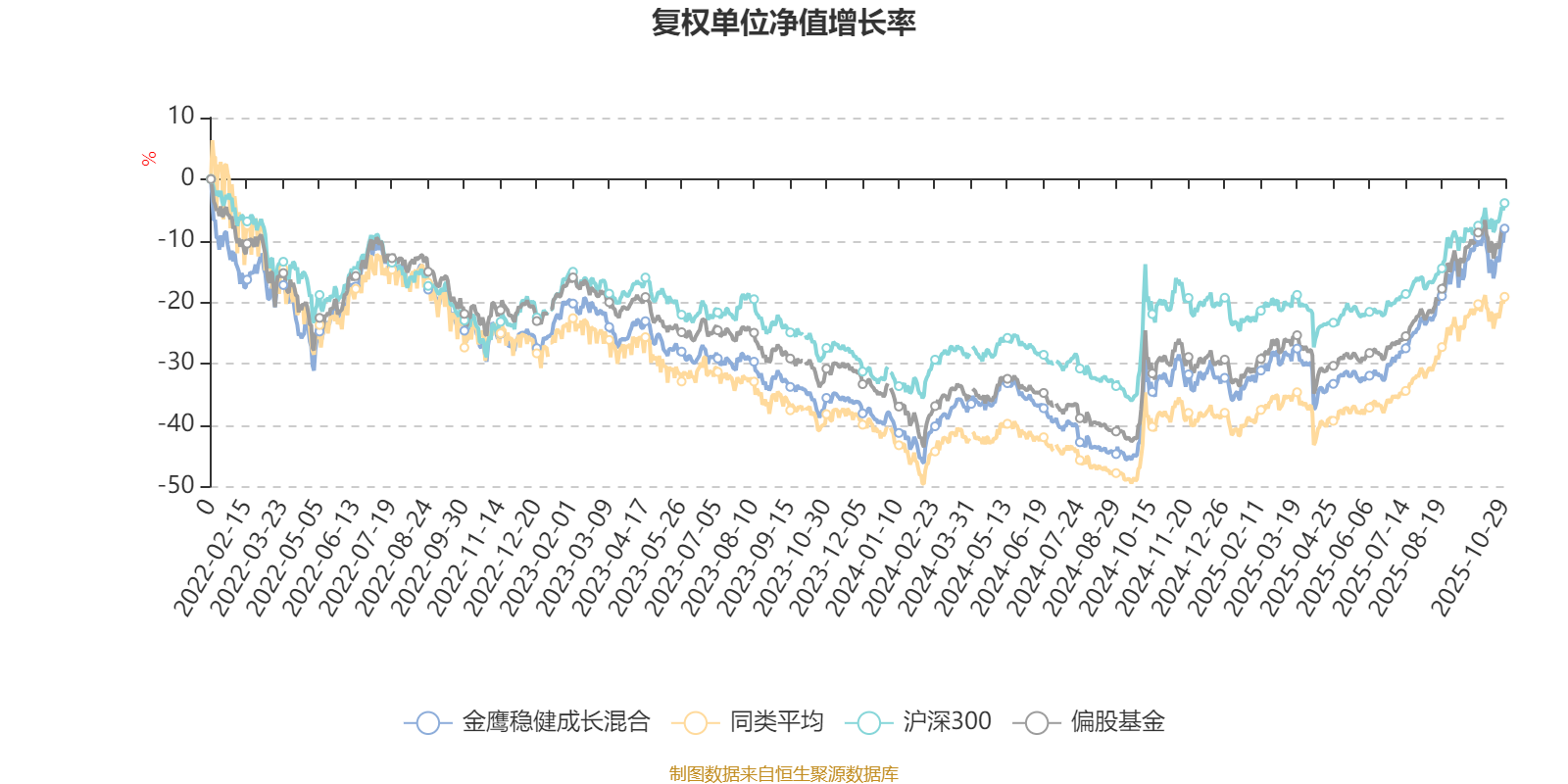 截至10月29日,金鹰稳健成长混合近三个月复权单位净值增长率为18.71%,位于同类可比基金220/621;近半年复权单位净值增长率为38.06%,位于同类可比基金191/621;近一年复权单位净值增长率为36.27%,位于同类可比基金242/611;近三年复权单位净值增长率为29.30%,位于同类可比基金186/518。