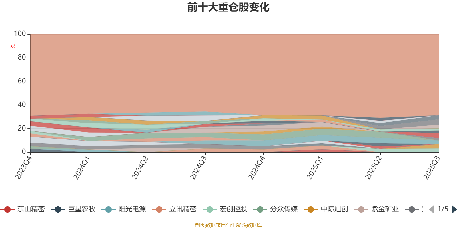 截至2025年三季度末,基金十大重仓股分别是工业富联、恒瑞医药、中际旭创、蓝思科技、宁德时代、宏创控股、中国平安、恺英网络、沪电股份、药明康德。