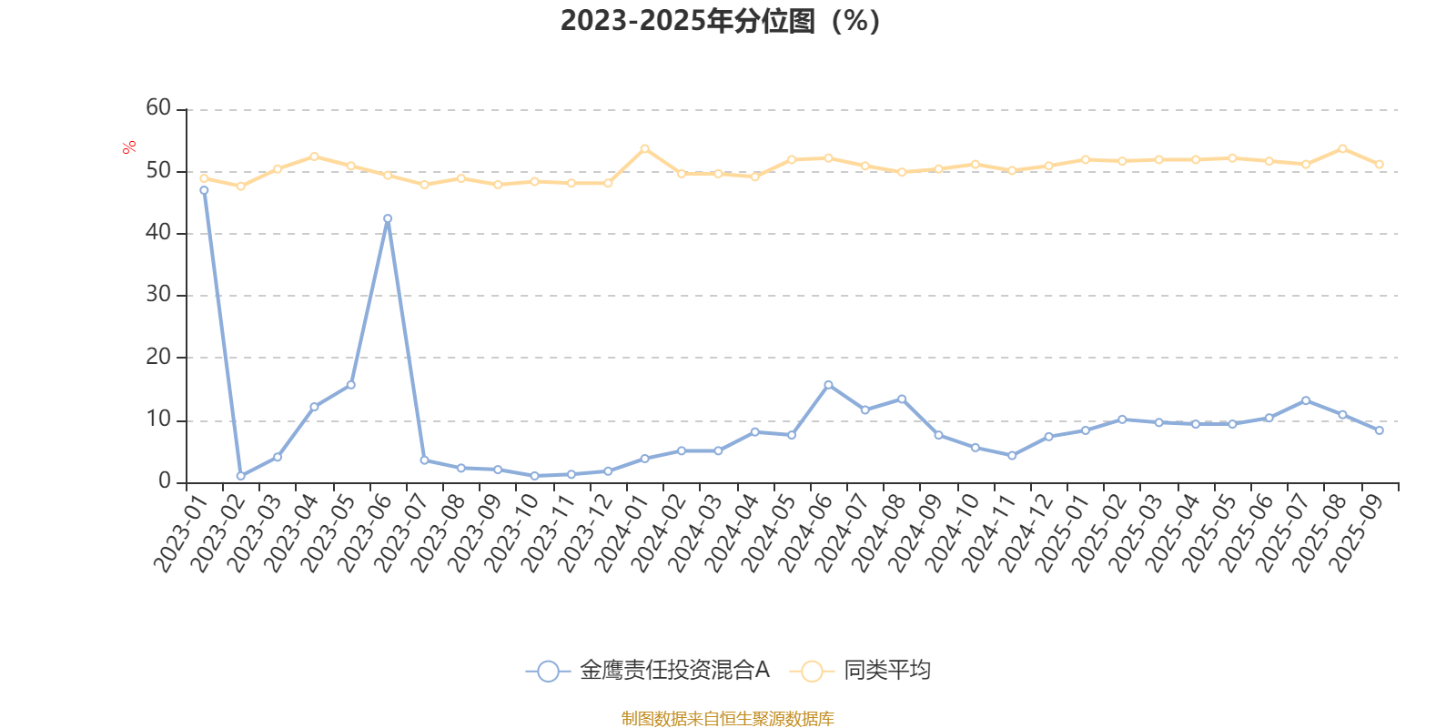 通过所选区间该基金净值增长率分位图,可以观察该基金与同类基金业绩比较情况。图为坐标原点到区间内某时点的净值增长率在同类基金中的分位数。