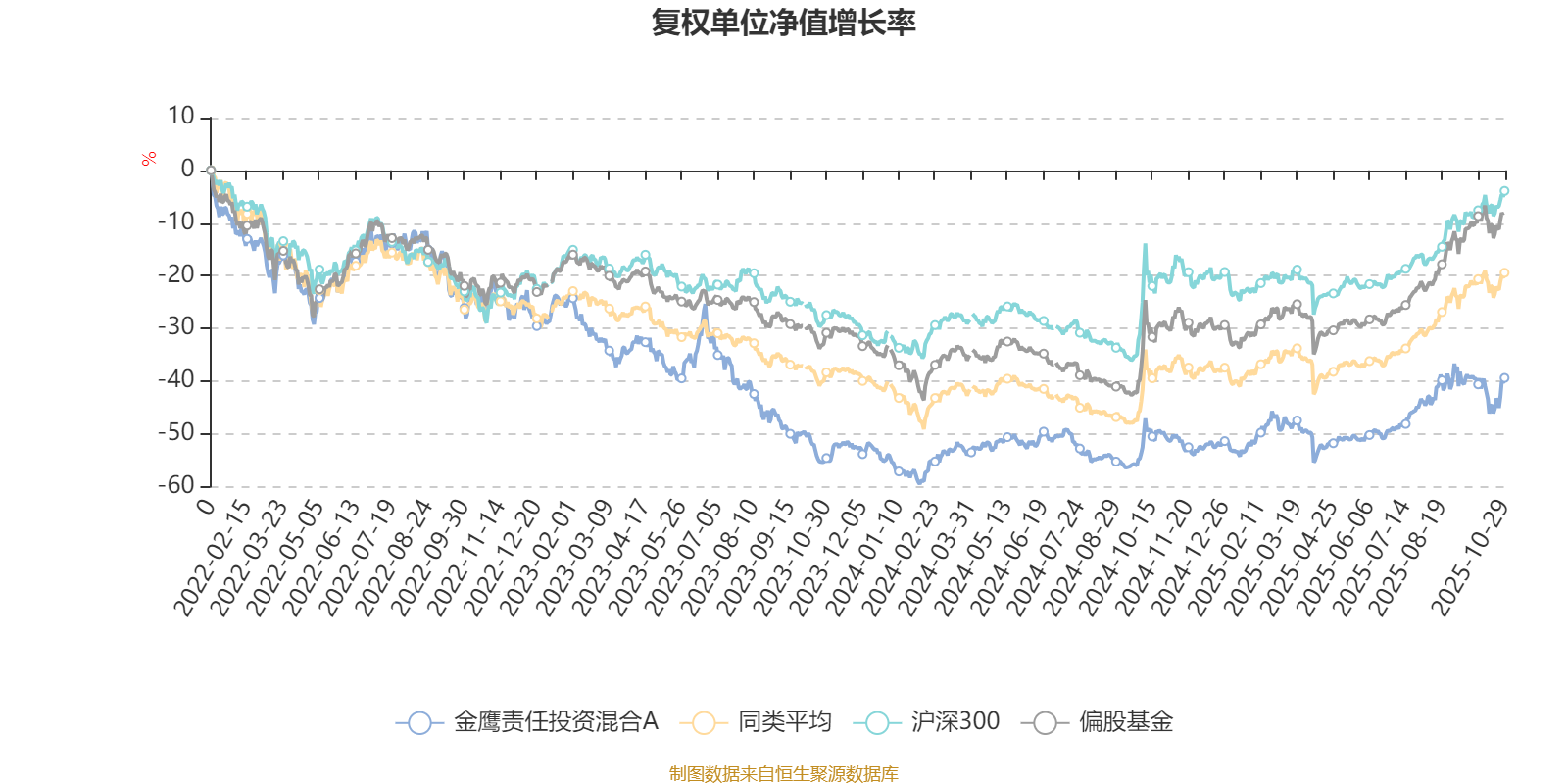截至10月29日,金鹰责任投资混合A近三个月复权单位净值增长率为7.00%,位于同类可比基金520/689;近半年复权单位净值增长率为25.33%,位于同类可比基金394/688;近一年复权单位净值增长率为22.70%,位于同类可比基金410/657;近三年复权单位净值增长率为-17.76%,位于同类可比基金336/364。