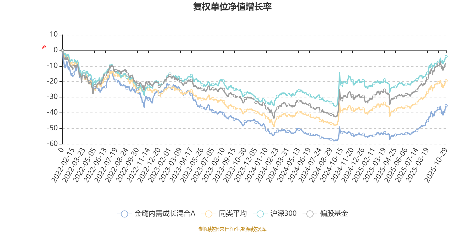截至10月29日,金鹰内需成长混合A近三个月复权单位净值增长率为24.39%,位于同类可比基金133/689;近半年复权单位净值增长率为41.06%,位于同类可比基金162/688;近一年复权单位净值增长率为36.82%,位于同类可比基金207/657;近三年复权单位净值增长率为0.66%,位于同类可比基金266/364。