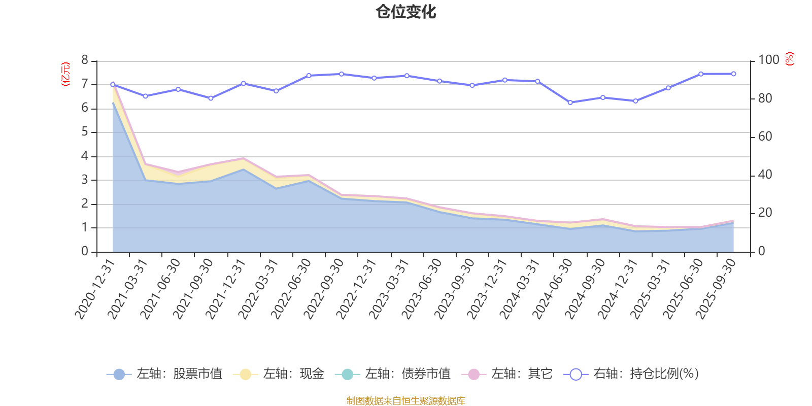 据定期报告数据统计,近三年平均股票仓位为87.47%,同类平均为83.73%。2025年三季度末基金达到93.25%的最高仓位,2024年上半年末最低,为78.23%。