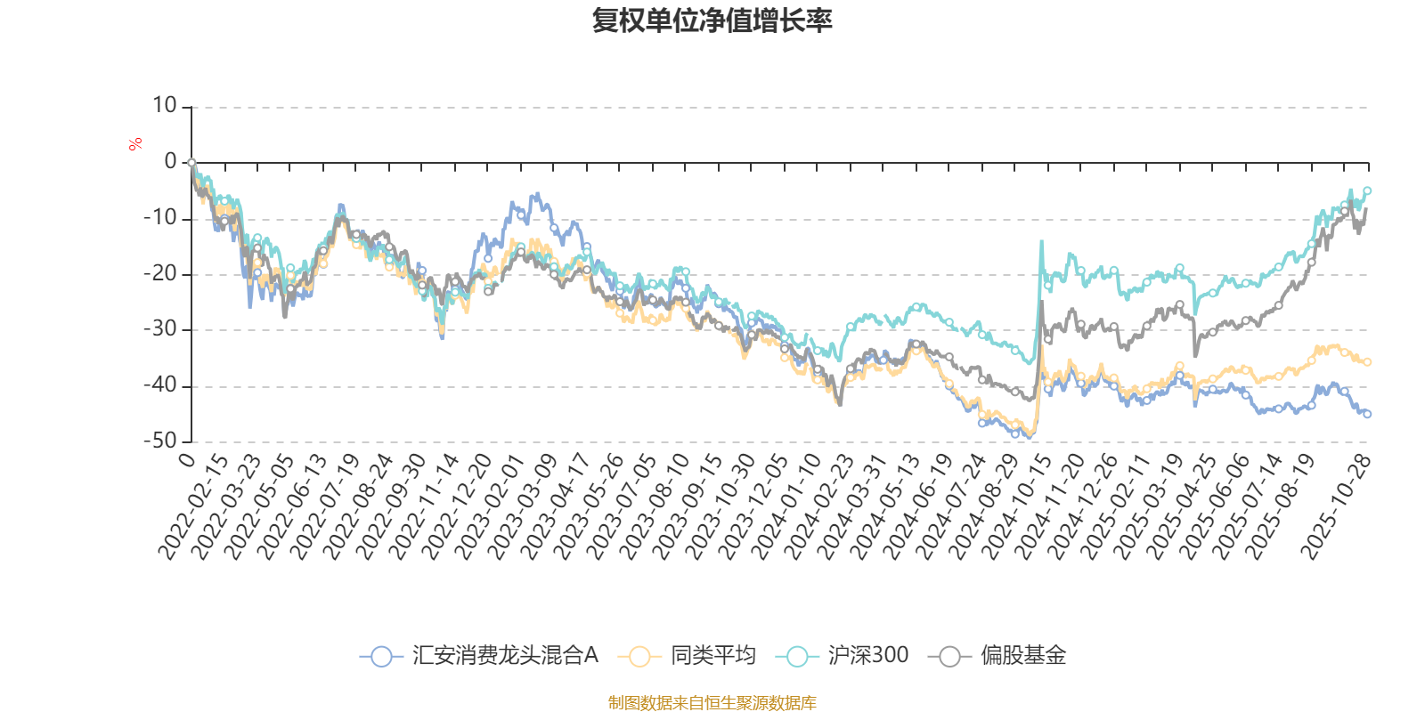 截至10月28日,汇安消费龙头混合A近三个月复权单位净值增长率为-2.33%,位于同类可比基金71/85;近半年复权单位净值增长率为-6.41%,位于同类可比基金84/85;近一年复权单位净值增长率为-10.56%,位于同类可比基金81/82;近三年复权单位净值增长率为-20.28%,位于同类可比基金72/74。