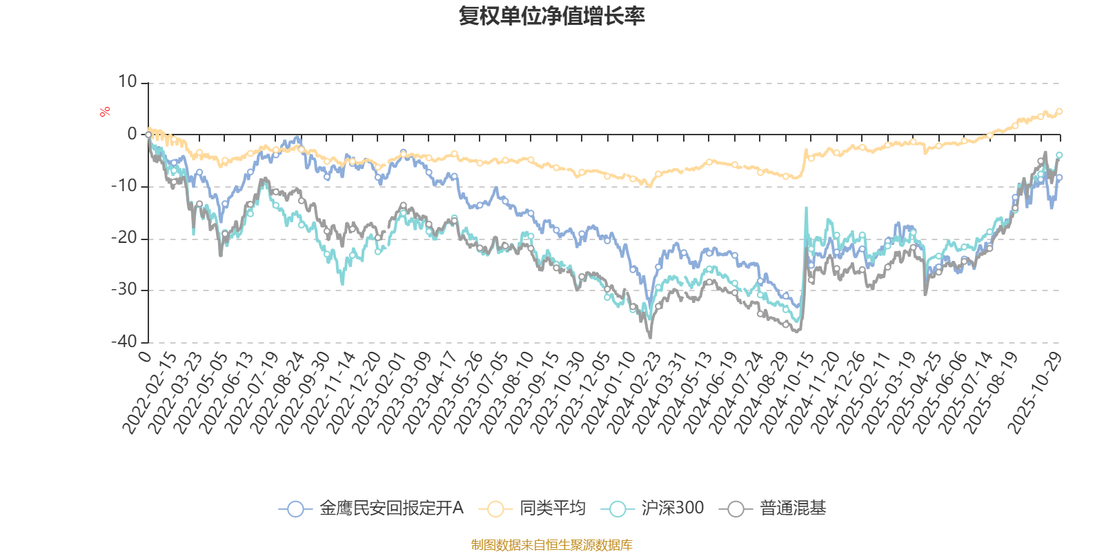 截至10月29日,金鹰民安回报定开A近三个月复权单位净值增长率为11.54%,位于同类可比基金16/629;近半年复权单位净值增长率为23.14%,位于同类可比基金10/629;近一年复权单位净值增长率为19.72%,位于同类可比基金29/623;近三年复权单位净值增长率为-0.26%,位于同类可比基金532/557。