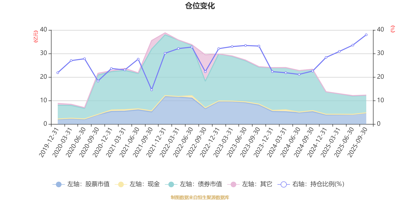 据定期报告数据统计,近三年平均股票仓位为29.19%,同类平均为19.14%。2025年三季度末基金达到37.97%的最高仓位,2021年三季度末最低,为14.57%。