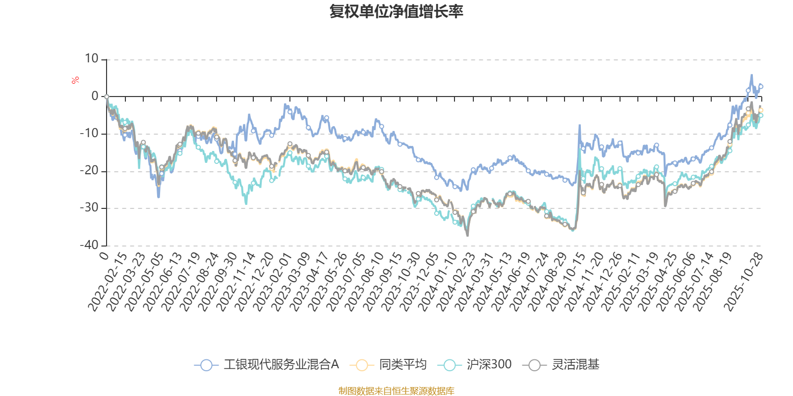 截至10月28日,工银现代服务业混合A近三个月复权单位净值增长率为14.20%,位于同类可比基金527/1287;近半年复权单位净值增长率为26.26%,位于同类可比基金580/1287;近一年复权单位净值增长率为17.44%,位于同类可比基金737/1287;近三年复权单位净值增长率为16.52%,位于同类可比基金638/1286。