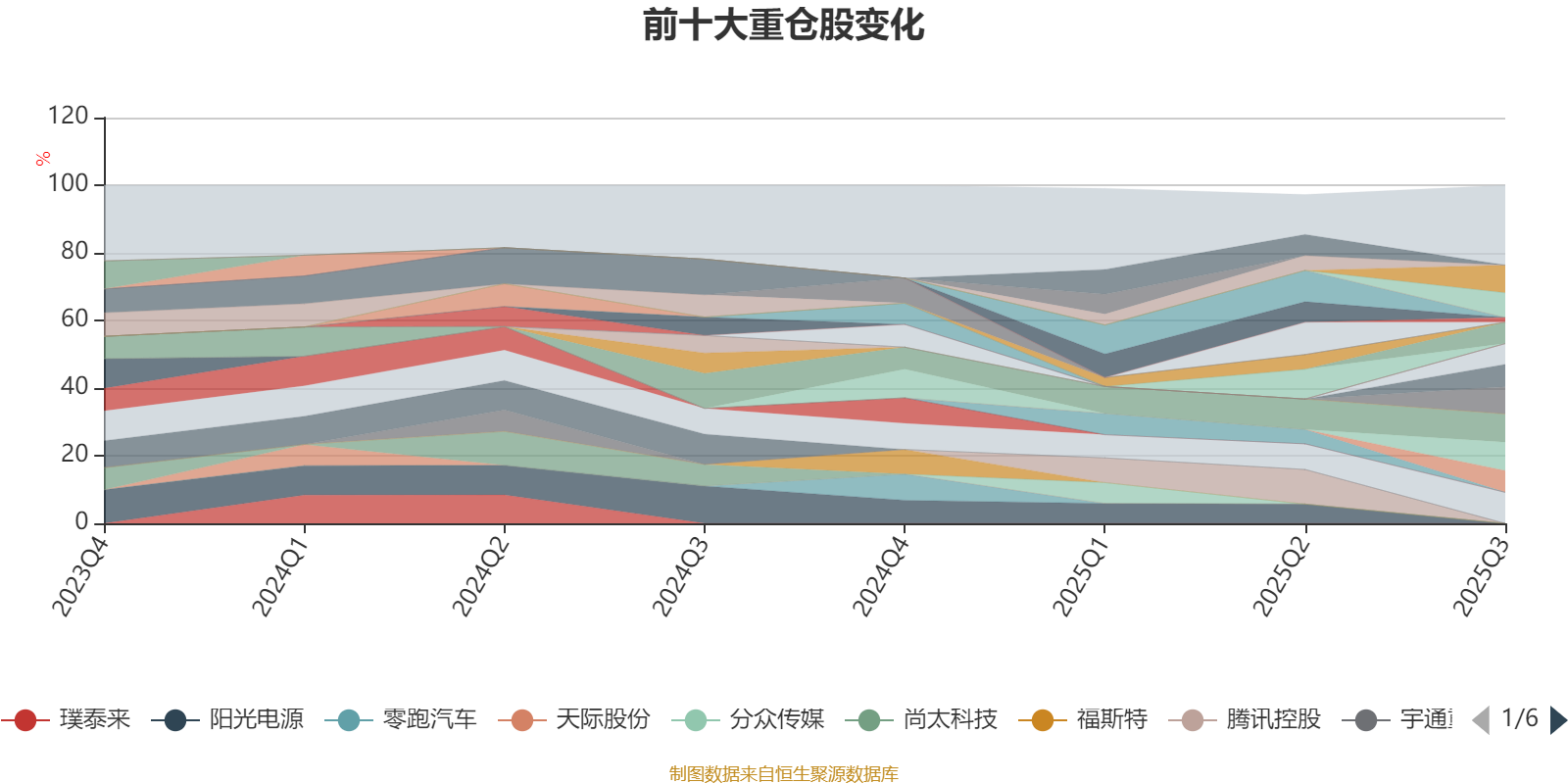 该基金持股集中度较高,近2年前十大重仓股集中度长期超过60%。截至2025年三季度末,基金十大重仓股分别是宁德时代、湖南裕能、通威股份、明阳智能、中创新航、天合光能、福莱特玻璃、阿特斯、晶科能源、信义光能。