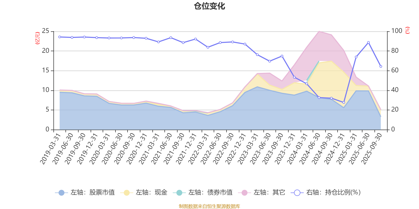 据定期报告数据统计,近三年平均股票仓位为60.62%,同类平均为72.35%。2019年一季度末基金达到94.32%的最高仓位,2024年末最低,为27.73%。