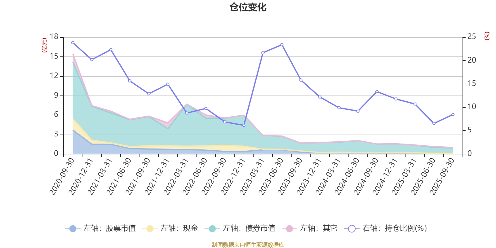 据定期报告数据统计,近三年平均股票仓位为12.42%,同类平均为19.14%。2020年三季度末基金达到23.83%的最高仓位,2022年末最低,为6.13%。