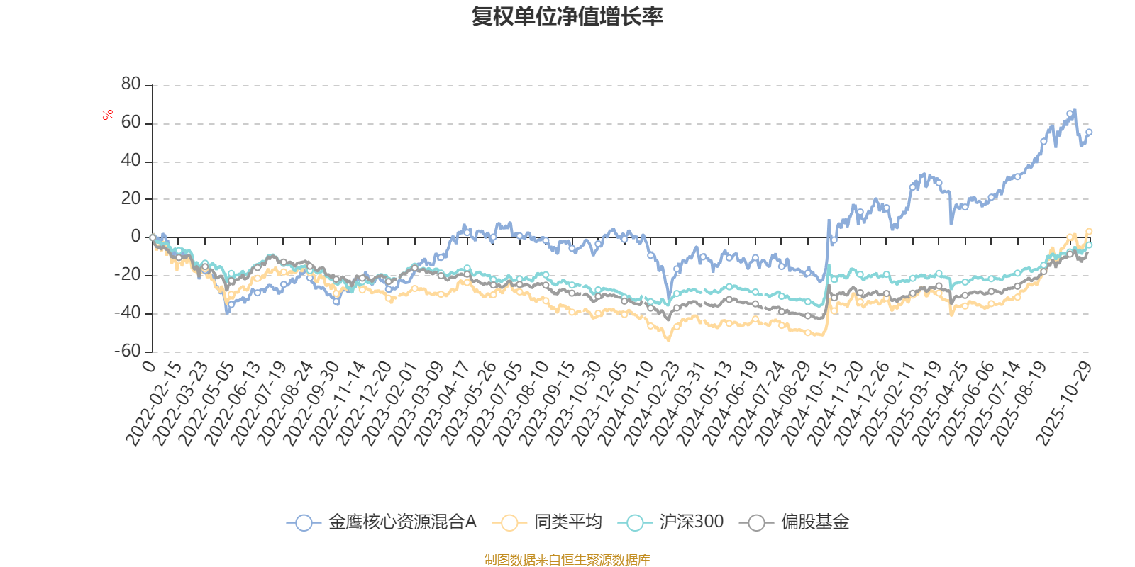 截至10月29日,金鹰核心资源混合A近三个月复权单位净值增长率为12.40%,位于同类可比基金210/229;近半年复权单位净值增长率为34.30%,位于同类可比基金182/229;近一年复权单位净值增长率为44.47%,位于同类可比基金154/213;近三年复权单位净值增长率为113.93%,位于同类可比基金11/158。