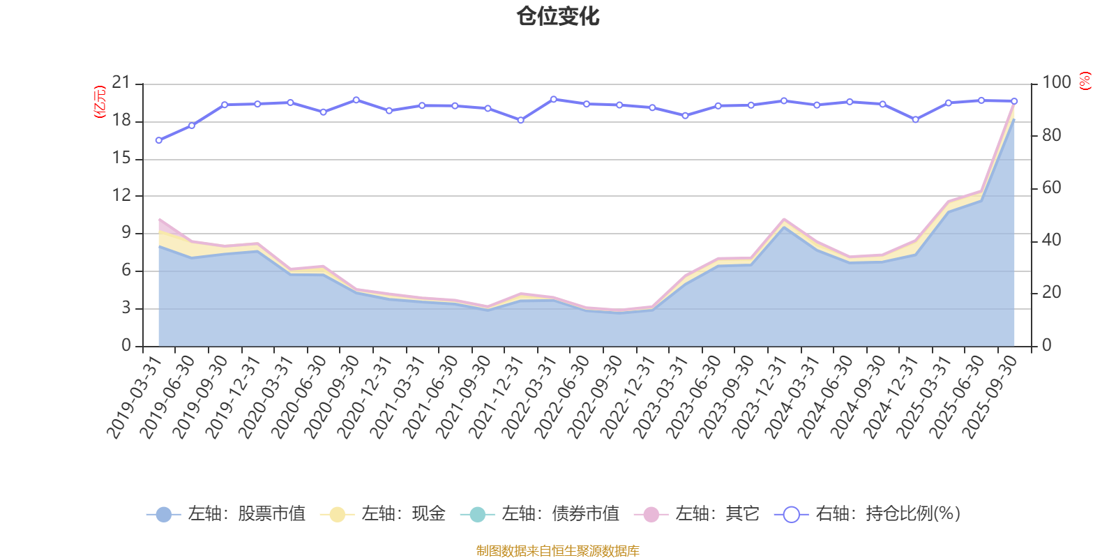 据定期报告数据统计,近三年平均股票仓位为91.57%,同类平均为86.77%。2022年一季度末基金达到94.08%的最高仓位,2019年一季度末最低,为78.46%。