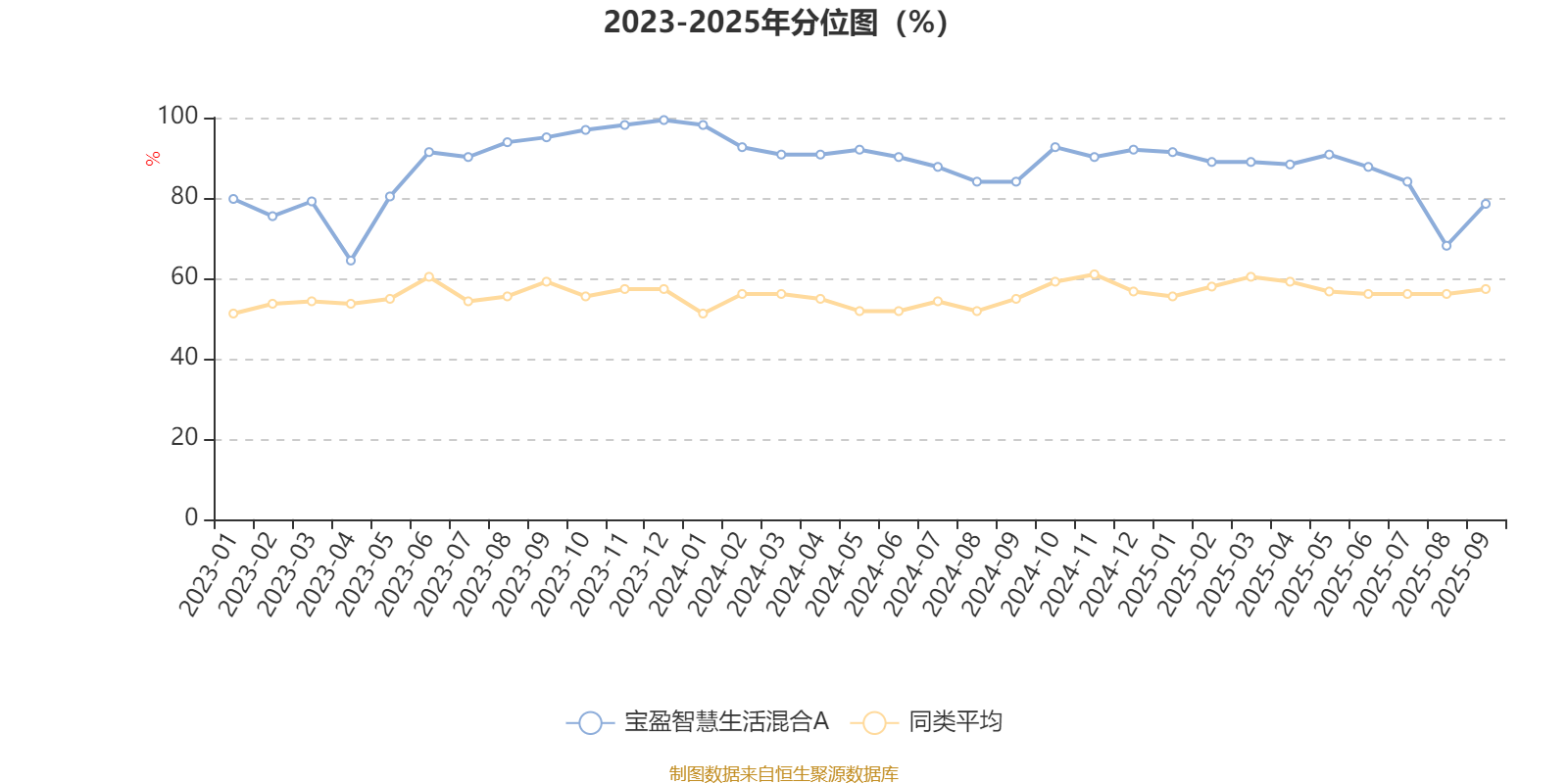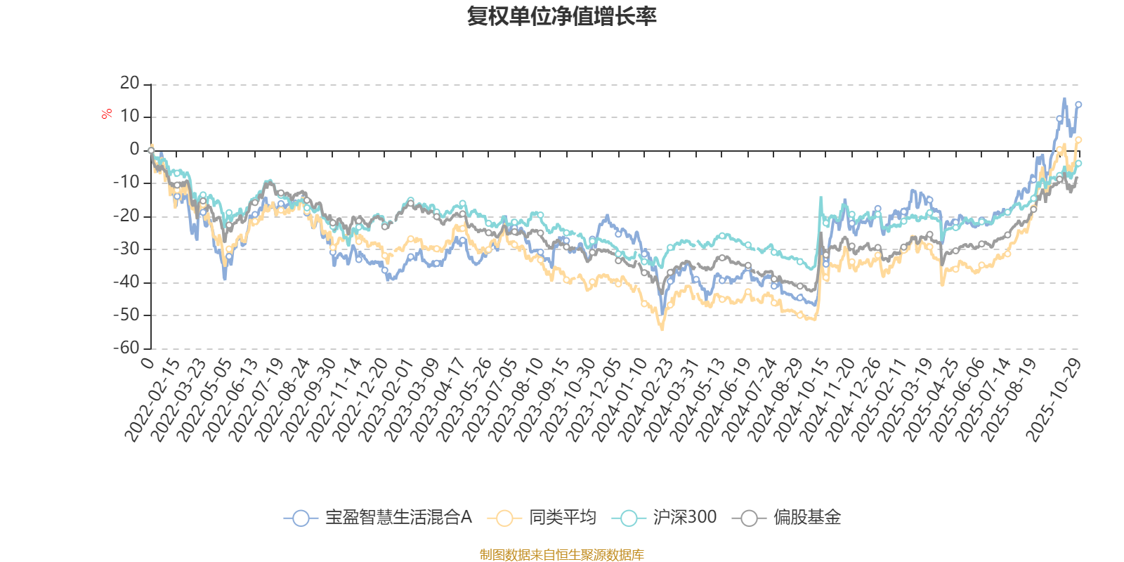 截至10月29日,宝盈智慧生活混合A近三个月复权单位净值增长率为29.51%,位于同类可比基金142/229;近半年复权单位净值增长率为46.66%,位于同类可比基金132/229;近一年复权单位净值增长率为45.28%,位于同类可比基金152/213;近三年复权单位净值增长率为74.27%,位于同类可比基金45/158。
