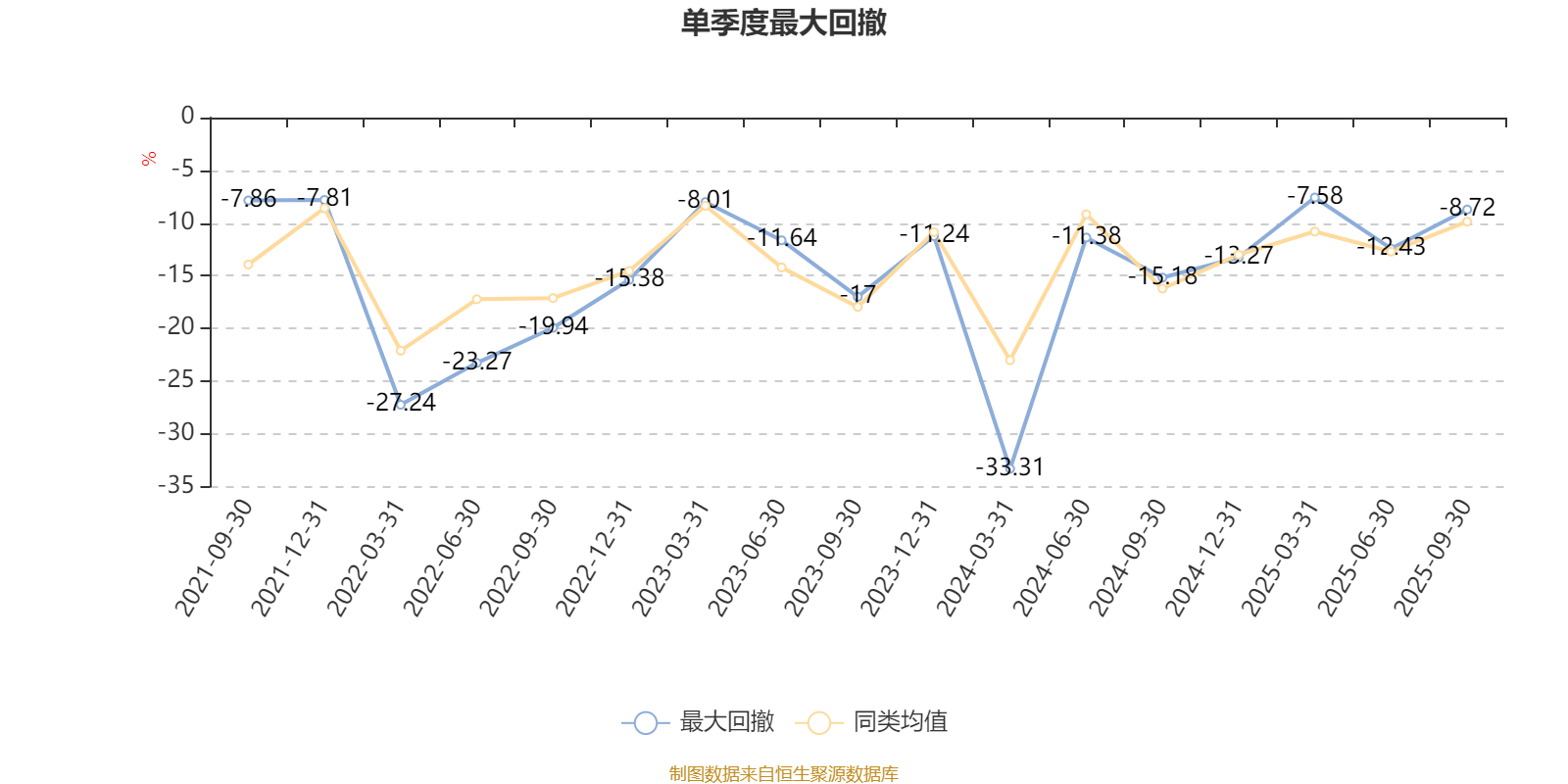 截至10月29日,基金近三年最大回撤为37.75%,同类可比基金排名43/159。单季度最大回撤出现在2024年一季度,为33.31%。