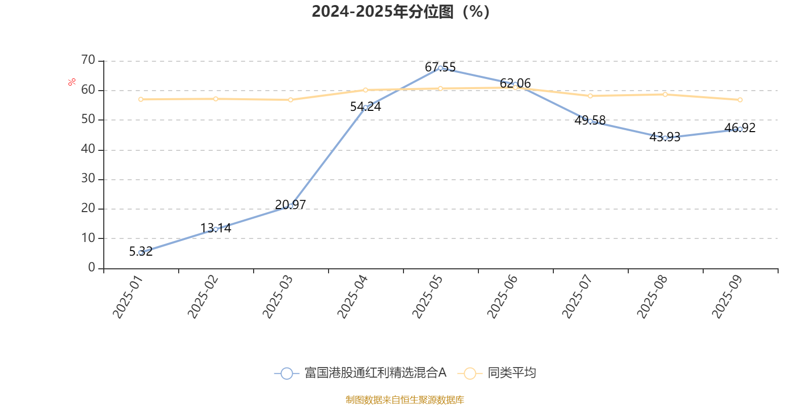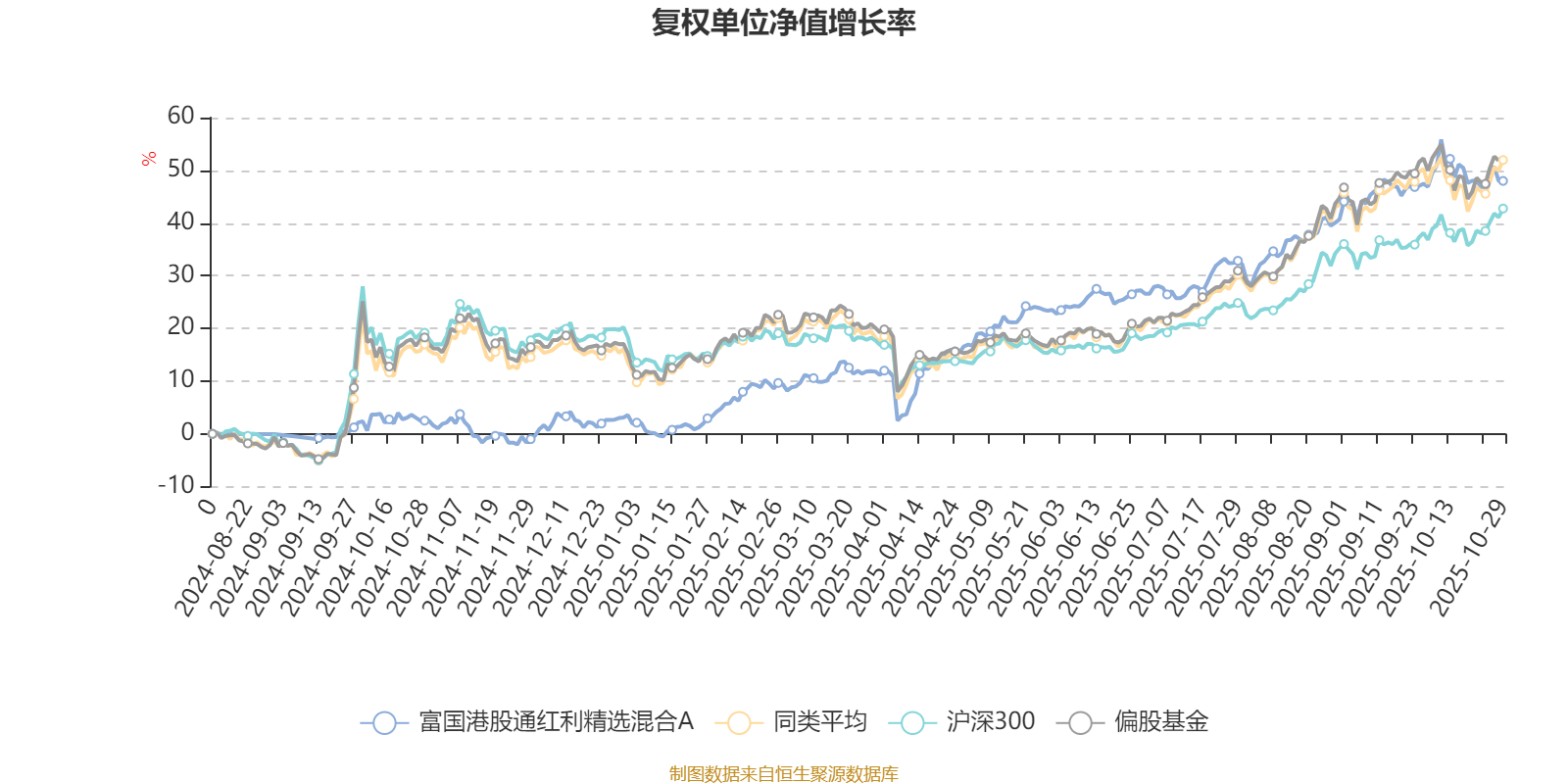 截至10月29日,富国港股通红利精选混合A近三个月复权单位净值增长率为11.40%,位于同类可比基金397/621;近半年复权单位净值增长率为26.54%,位于同类可比基金381/621;近一年复权单位净值增长率为44.40%,位于同类可比基金154/611。