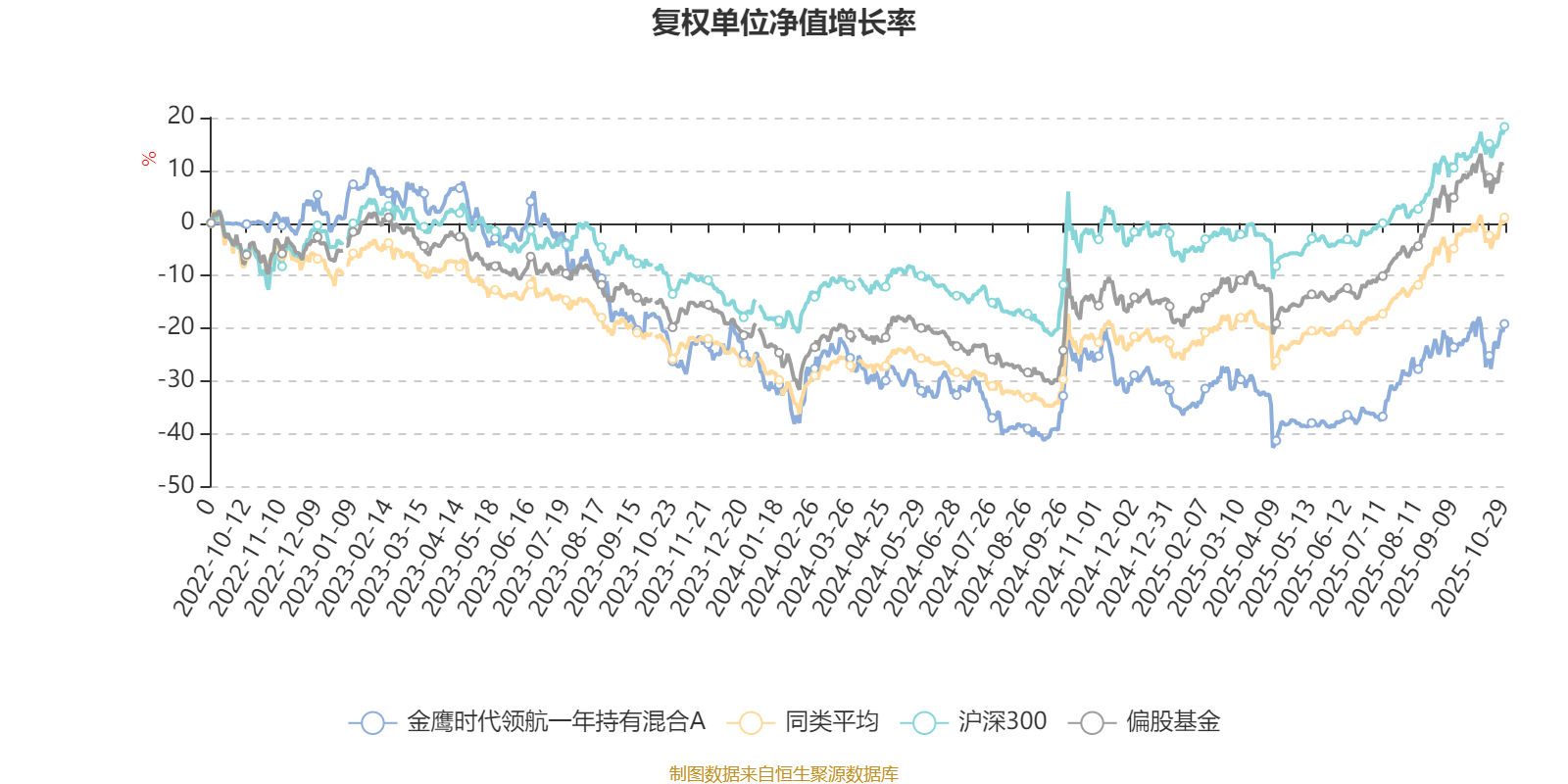 截至10月29日,金鹰时代领航一年持有混合A近三个月复权单位净值增长率为12.07%,位于同类可比基金385/689;近半年复权单位净值增长率为30.66%,位于同类可比基金312/688;近一年复权单位净值增长率为9.51%,位于同类可比基金596/657;近三年复权单位净值增长率为-18.13%,位于同类可比基金337/364。