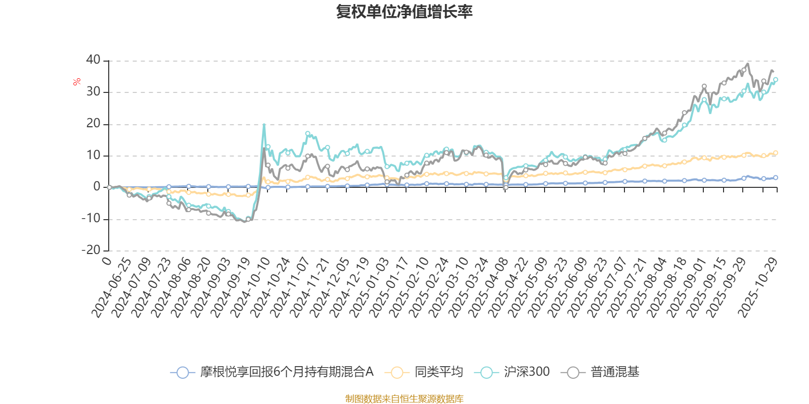 截至10月29日,摩根悦享回报6个月持有期混合A近三个月复权单位净值增长率为1.10%,位于同类可比基金509/629;近半年复权单位净值增长率为2.14%,位于同类可比基金567/629;近一年复权单位净值增长率为2.98%,位于同类可比基金580/623。