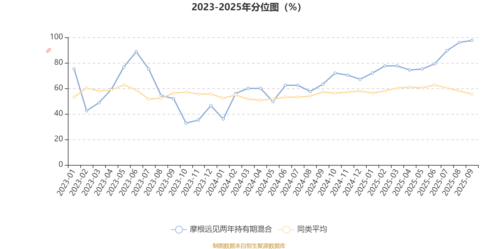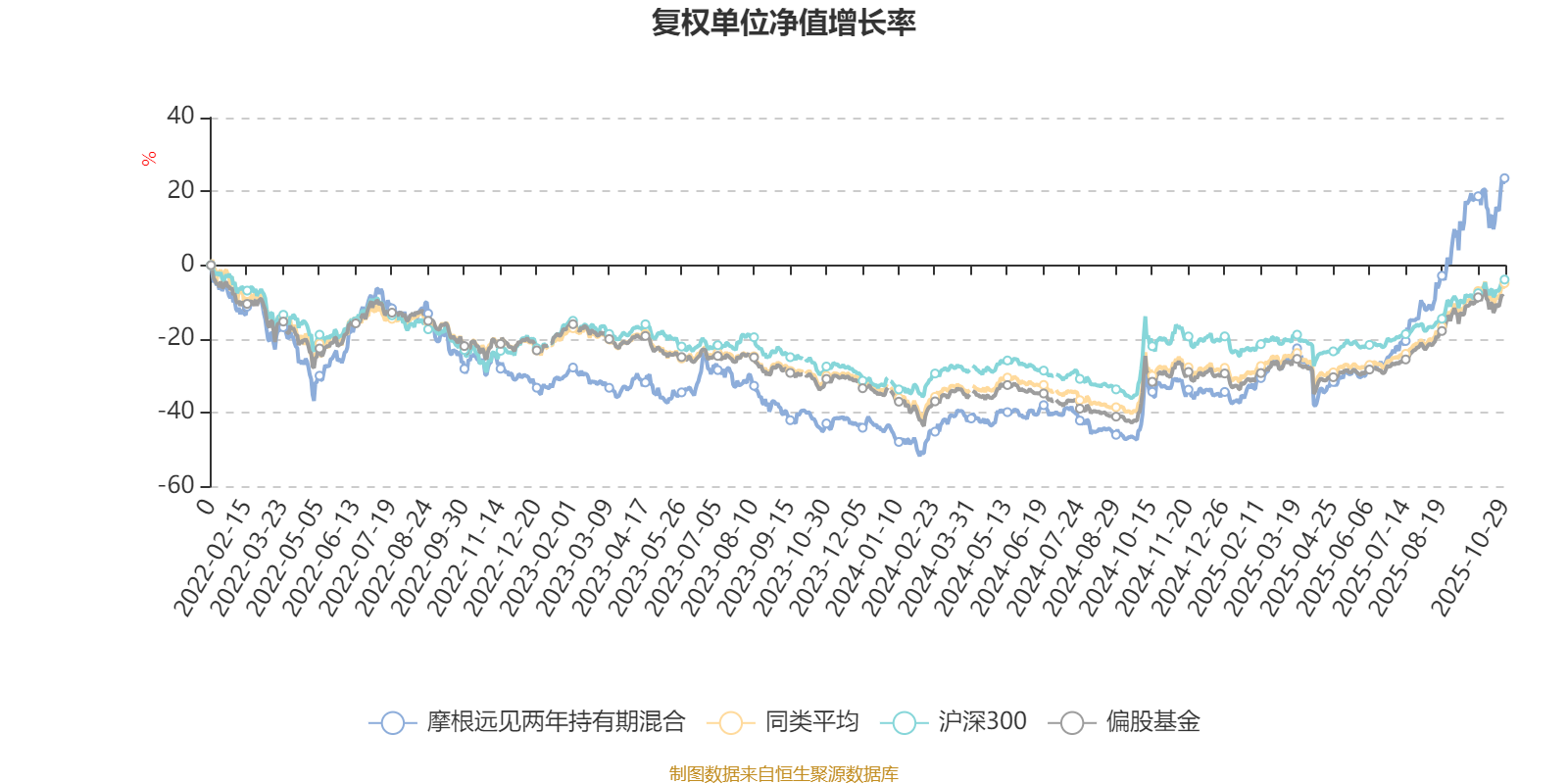 截至10月29日,摩根远见两年持有期混合近三个月复权单位净值增长率为36.57%,位于同类可比基金13/130;近半年复权单位净值增长率为83.43%,位于同类可比基金4/130;近一年复权单位净值增长率为84.83%,位于同类可比基金2/130;近三年复权单位净值增长率为75.76%,位于同类可比基金6/124。