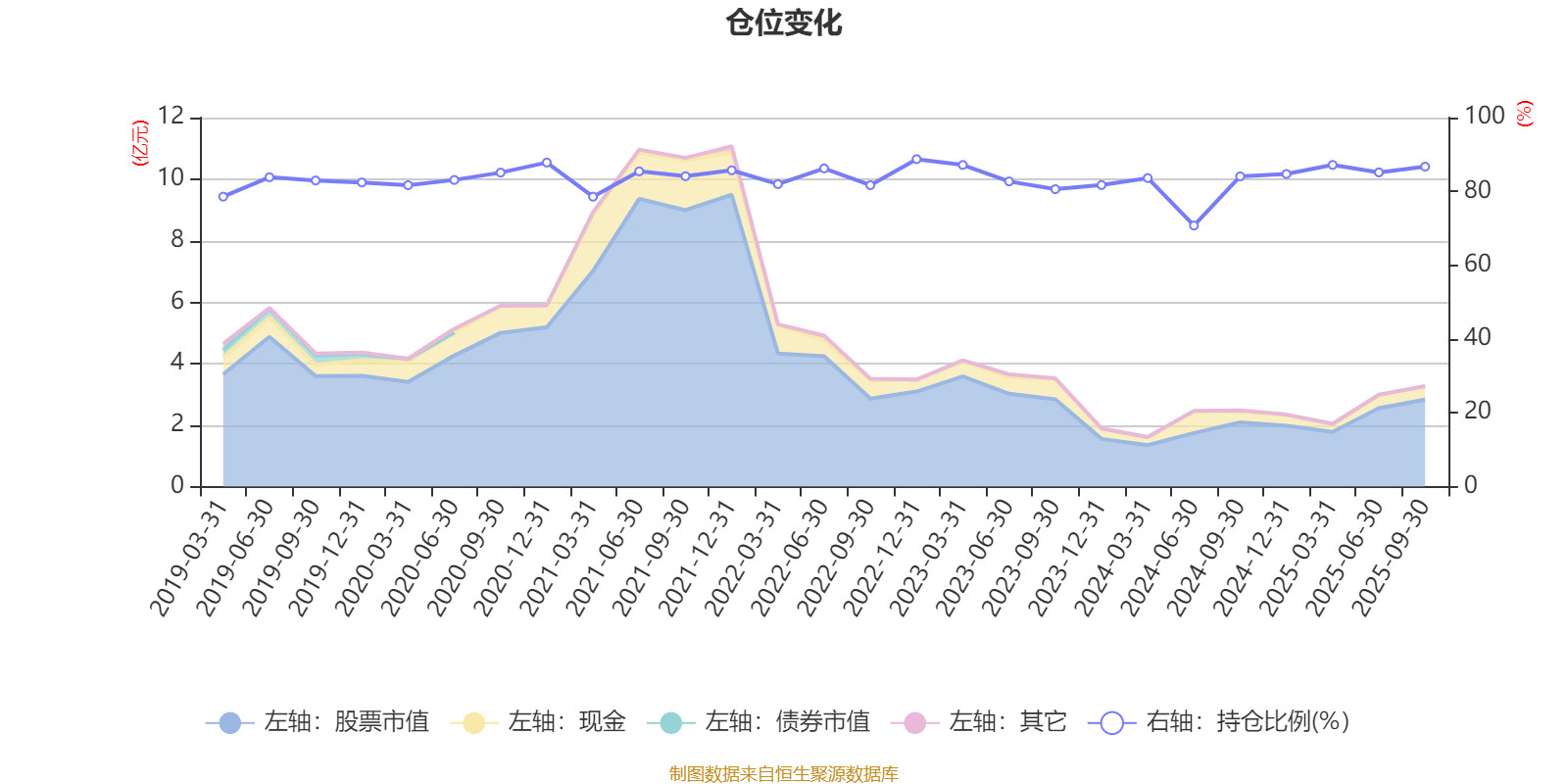 据定期报告数据统计,近三年平均股票仓位为83.59%,同类平均为72.35%。2022年末基金达到88.74%的最高仓位,2024年上半年末最低,为70.75%。