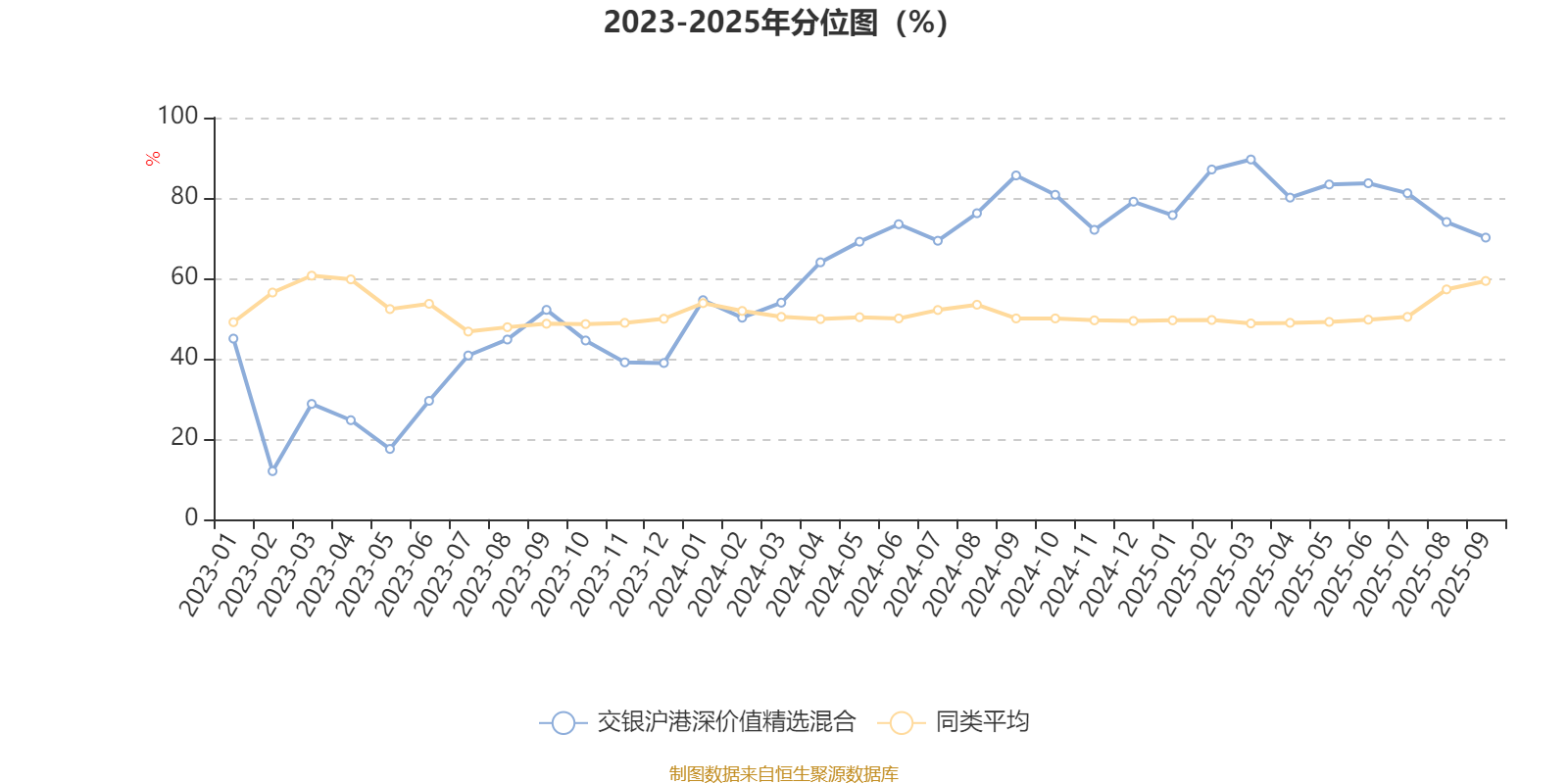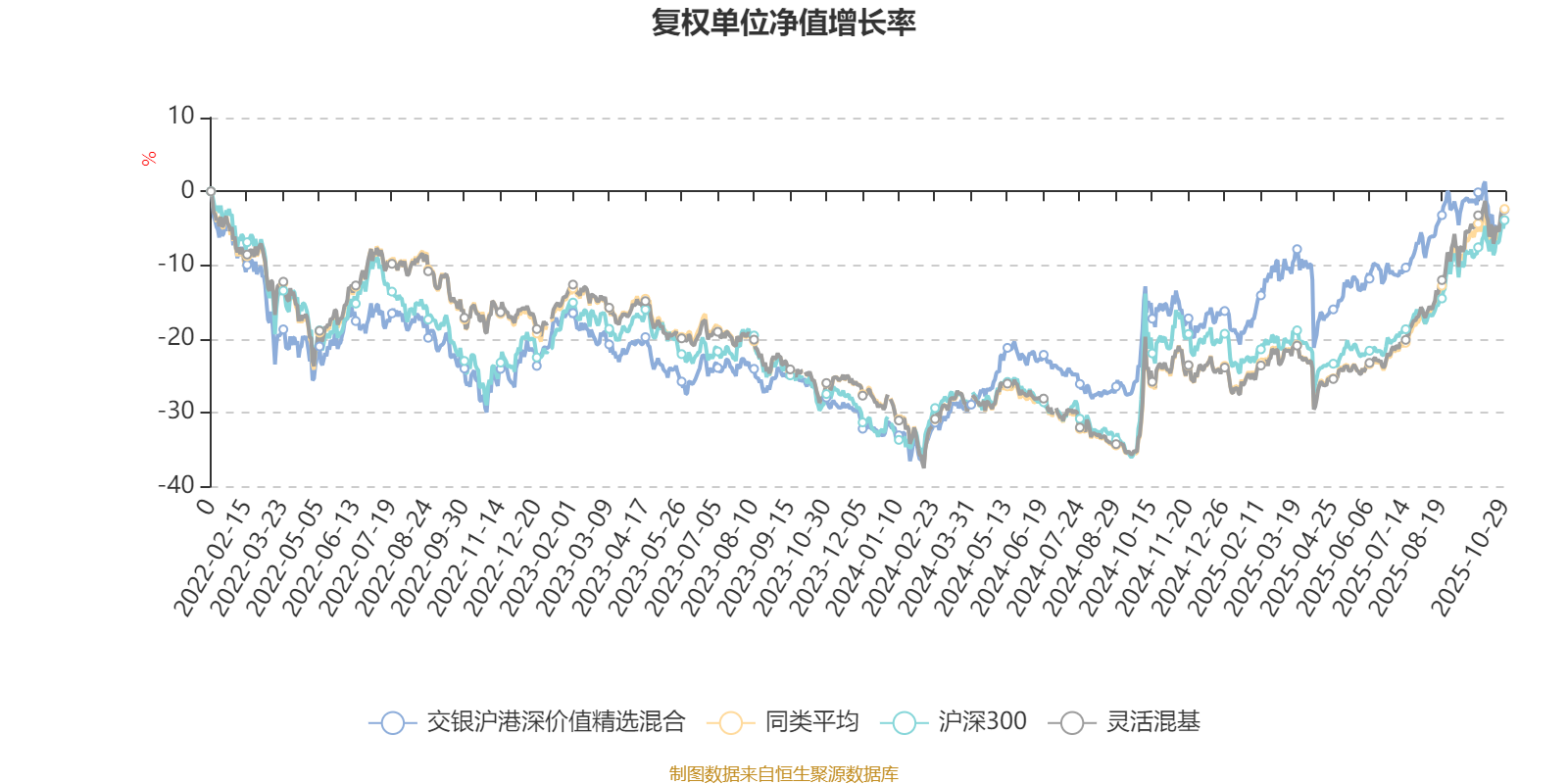 截至10月29日,交银沪港深价值精选混合近三个月复权单位净值增长率为3.26%,位于同类可比基金1023/1287;近半年复权单位净值增长率为15.75%,位于同类可比基金899/1287;近一年复权单位净值增长率为15.13%,位于同类可比基金842/1287;近三年复权单位净值增长率为38.10%,位于同类可比基金287/1286。