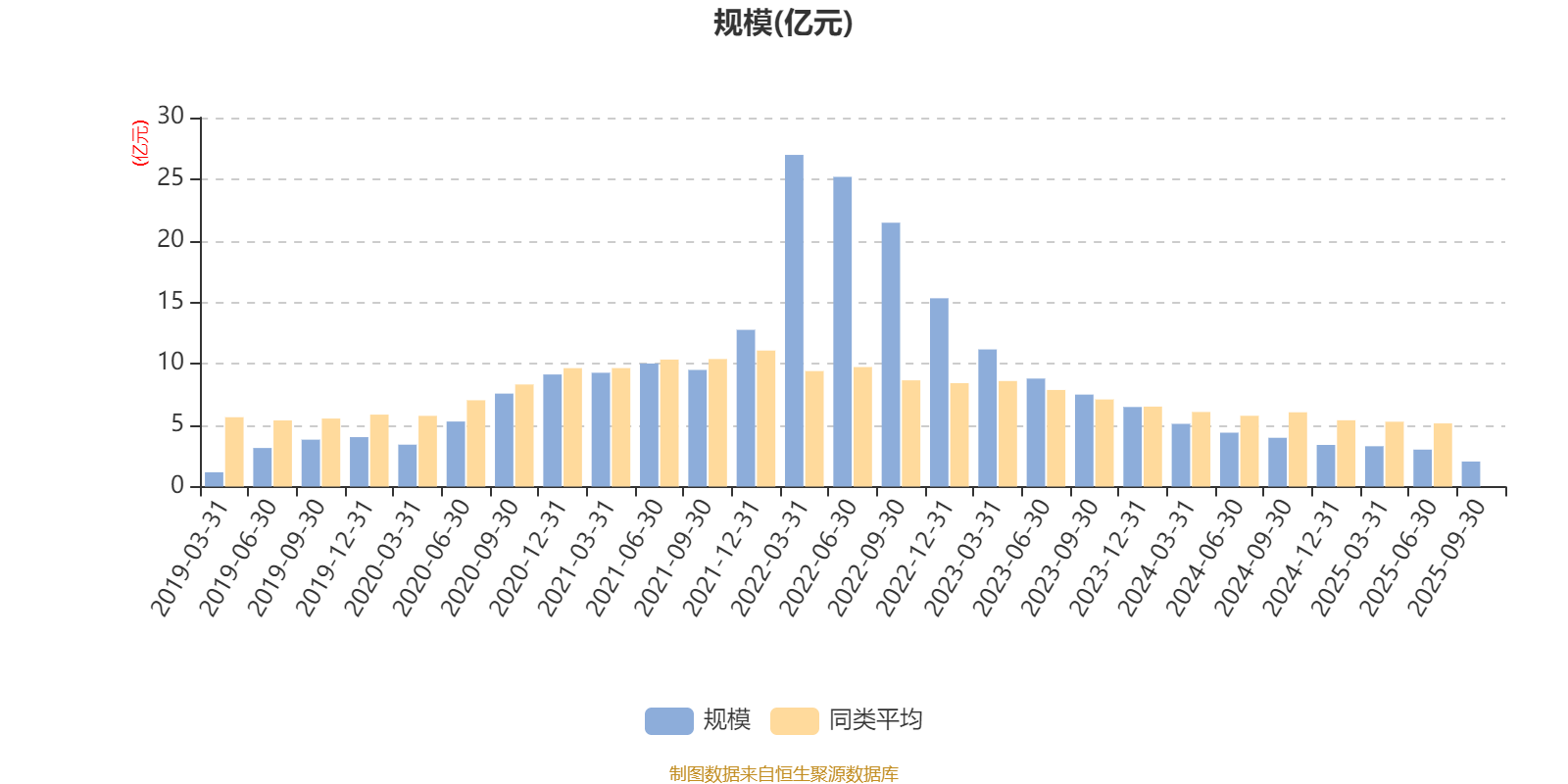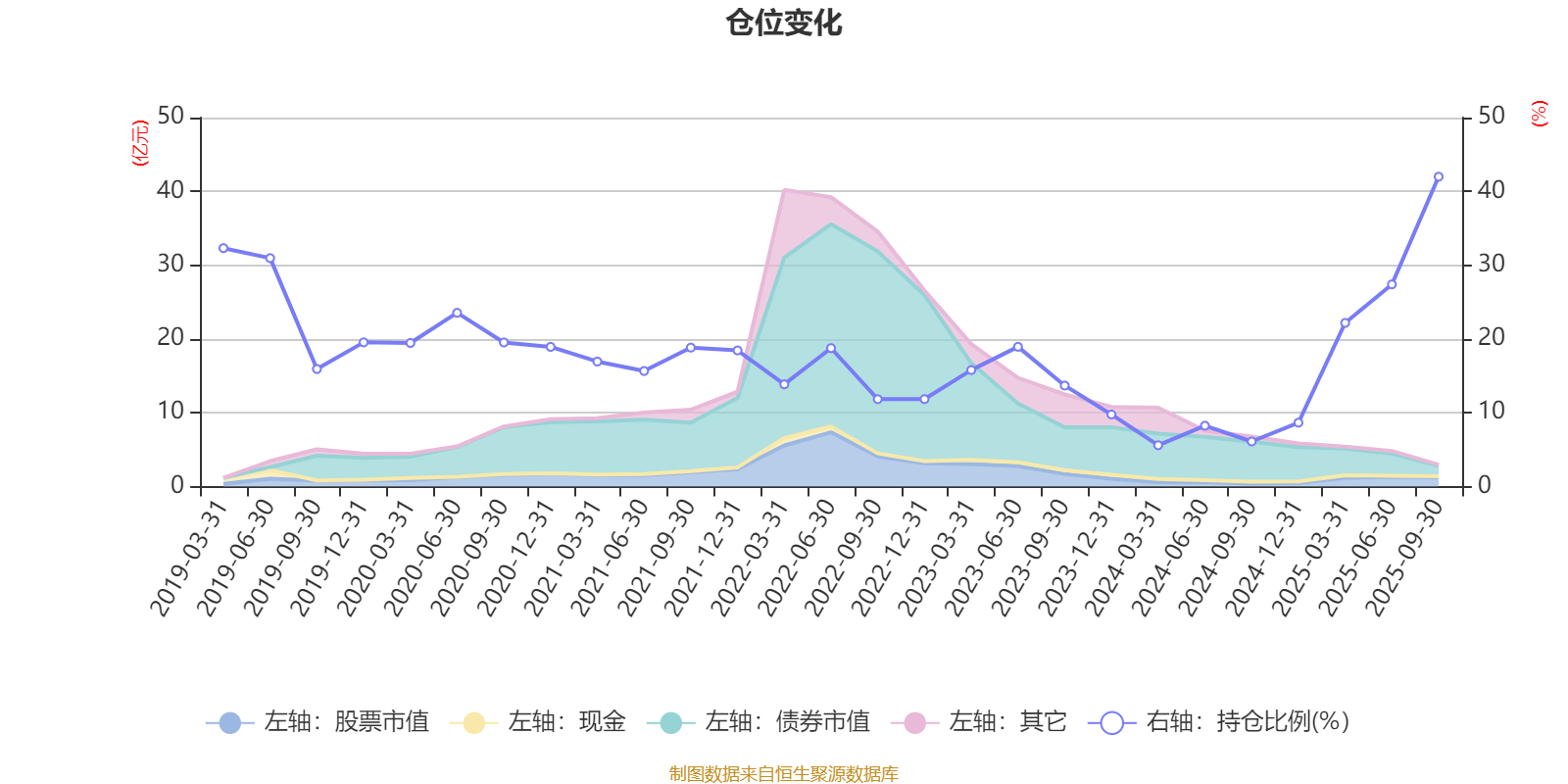据定期报告数据统计,近三年平均股票仓位为15.85%,同类平均为72.35%。2025年三季度末基金达到41.99%的最高仓位,2024年一季度末最低,为5.6%。
