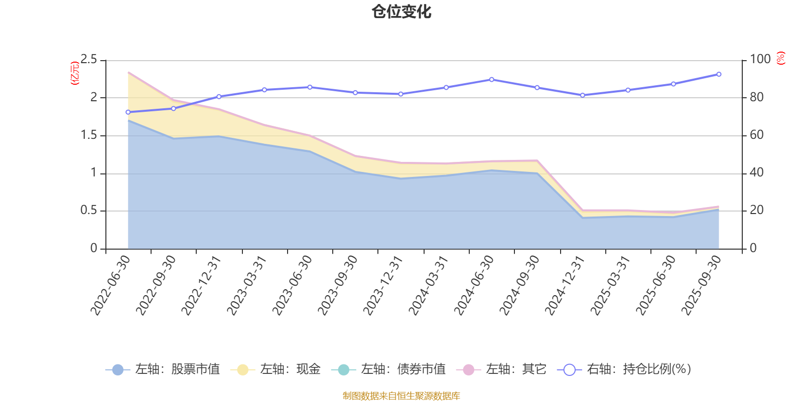 据定期报告数据统计,近三年平均股票仓位为85.14%,同类平均为83.73%。2025年三季度末基金达到92.55%的最高仓位,2022年上半年末最低,为72.46%。