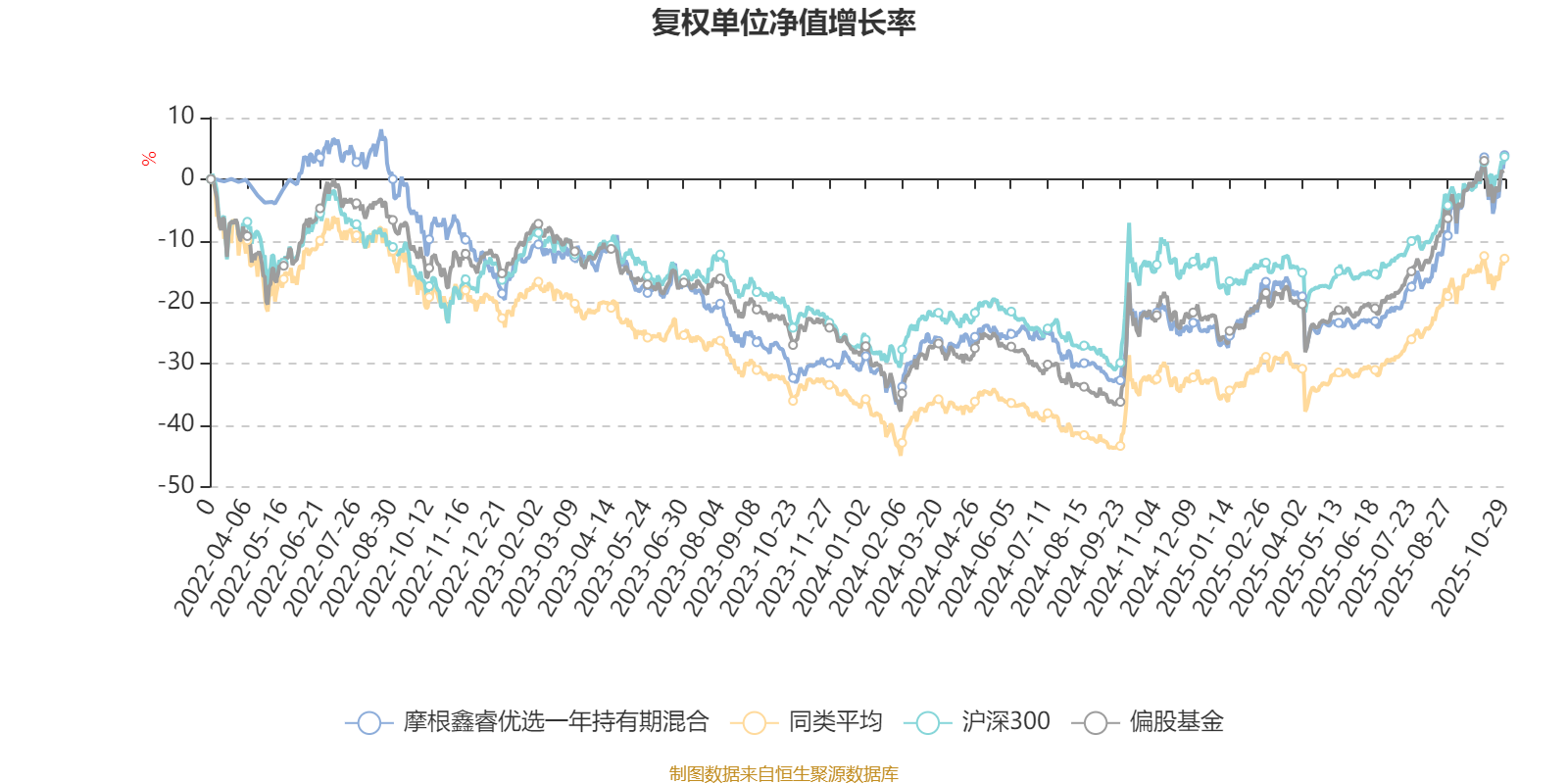 截至10月29日,摩根鑫睿优选一年持有期混合近三个月复权单位净值增长率为22.18%,位于同类可比基金162/689;近半年复权单位净值增长率为36.37%,位于同类可比基金225/688;近一年复权单位净值增长率为33.67%,位于同类可比基金256/657;近三年复权单位净值增长率为15.24%,位于同类可比基金193/364。