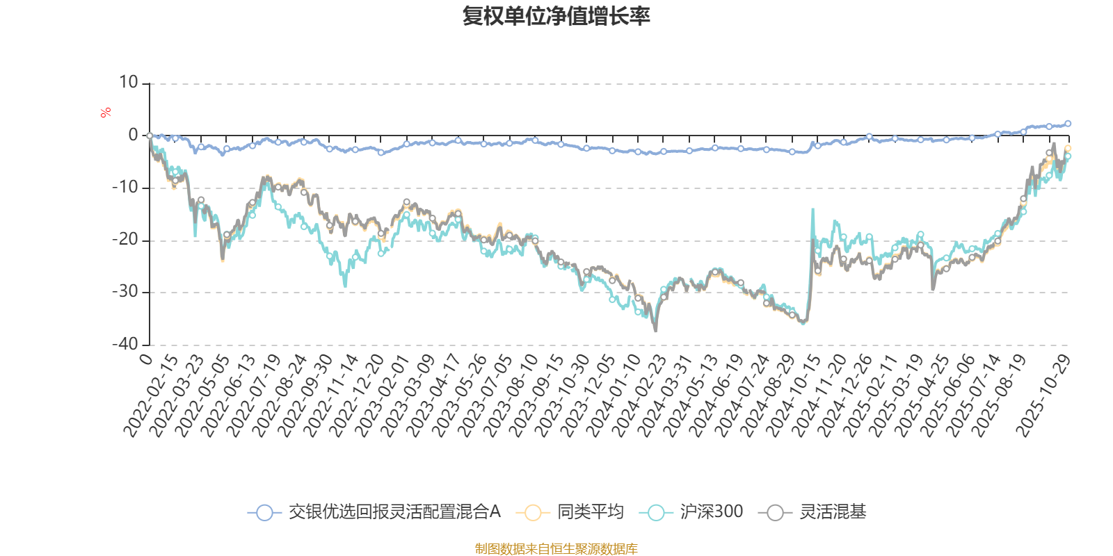 截至10月29日,交银优选回报灵活配置混合A近三个月复权单位净值增长率为1.66%,位于同类可比基金1127/1287;近半年复权单位净值增长率为3.16%,位于同类可比基金1214/1287;近一年复权单位净值增长率为3.90%,位于同类可比基金1190/1287;近三年复权单位净值增长率为5.58%,位于同类可比基金925/1286。