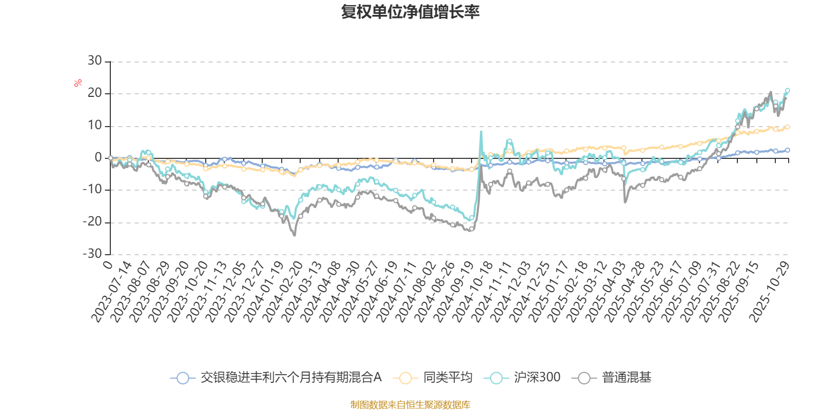截至10月29日,交银稳进丰利六个月持有期混合A近三个月复权单位净值增长率为2.27%,位于同类可比基金353/629;近半年复权单位净值增长率为4.17%,位于同类可比基金422/629;近一年复权单位净值增长率为4.51%,位于同类可比基金512/623。