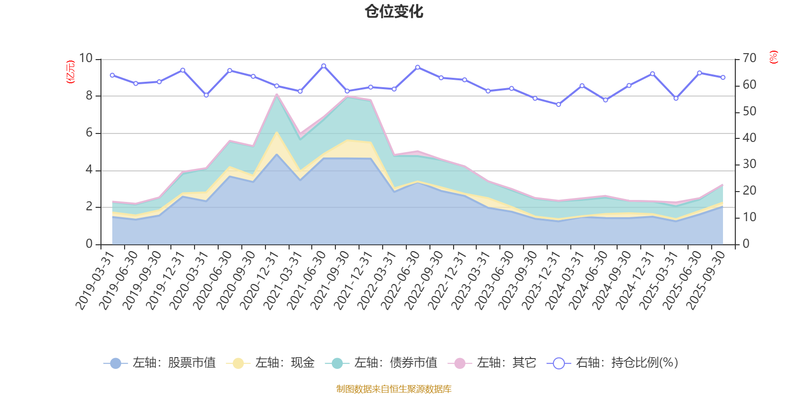 据定期报告数据统计,近三年平均股票仓位为59.1%,同类平均为67.37%。2021年上半年末基金达到67.45%的最高仓位,2023年末最低,为52.88%。