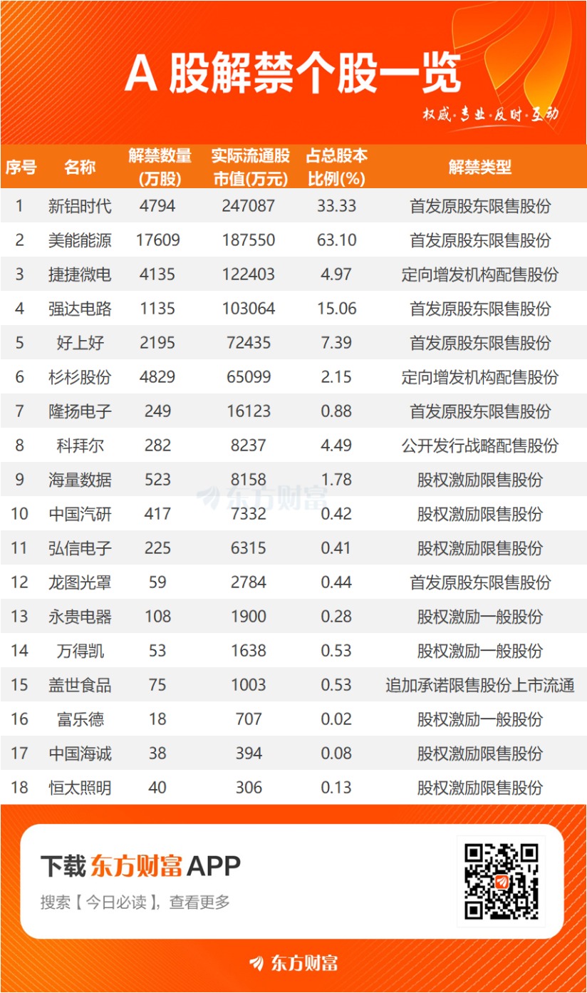 【明日解禁】明日18股解禁 新铝时代、美能能源解禁市值居前