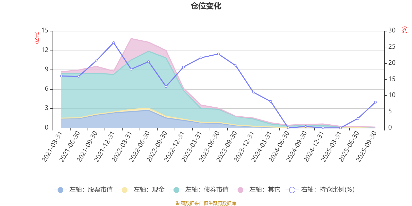 据定期报告数据统计,近三年平均股票仓位为9.42%,同类平均为19.14%。2021年末基金达到26.37%的最高仓位,2024年三季度末最低,为0.42%。