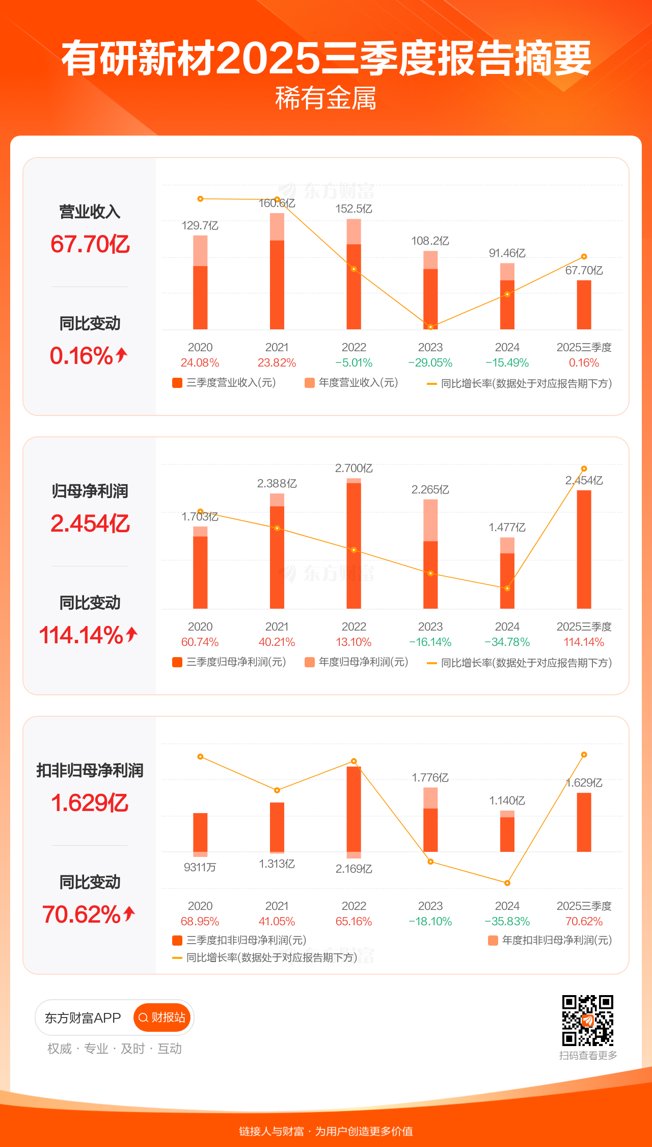 有研新材10月31日发布2025年三季报显示,公司前三季实现营业收入67.70亿元,同比增长0.16%;归母净利润2.45亿元,同比增长114.14%;扣非归母净利润1.63亿元,同比增长70.62%。