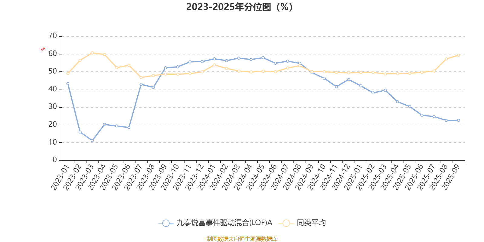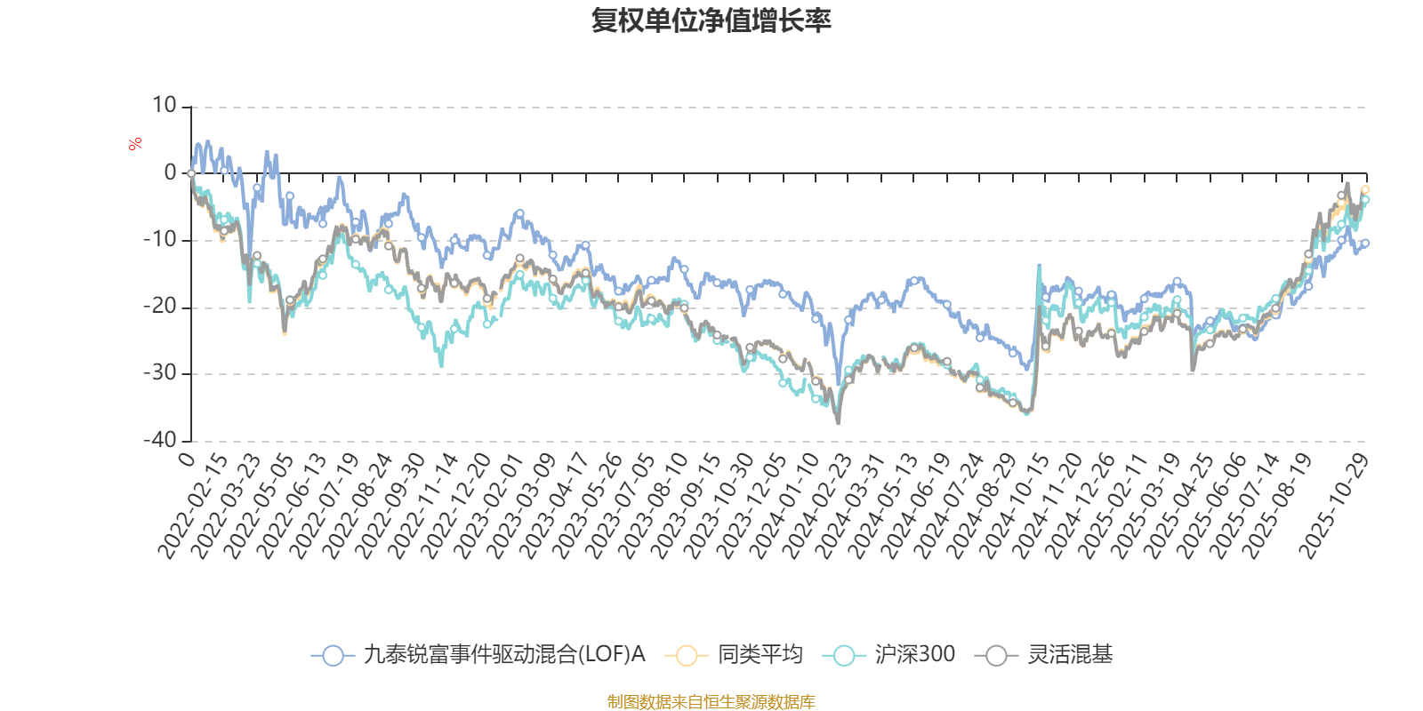截至10月29日,九泰锐富事件驱动混合(LOF)A近三个月复权单位净值增长率为9.40%,位于同类可比基金761/1287;近半年复权单位净值增长率为16.12%,位于同类可比基金892/1287;近一年复权单位净值增长率为8.81%,位于同类可比基金1024/1287;近三年复权单位净值增长率为2.62%,位于同类可比基金985/1286。