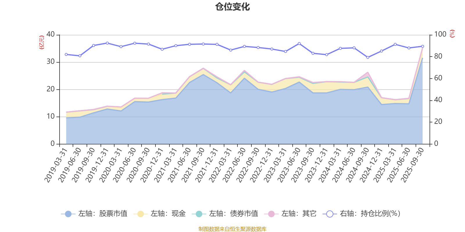 据定期报告数据统计,近三年平均股票仓位为86.45%,同类平均为72.35%。2019年末基金达到92.41%的最高仓位,2024年三季度末最低,为79.33%。