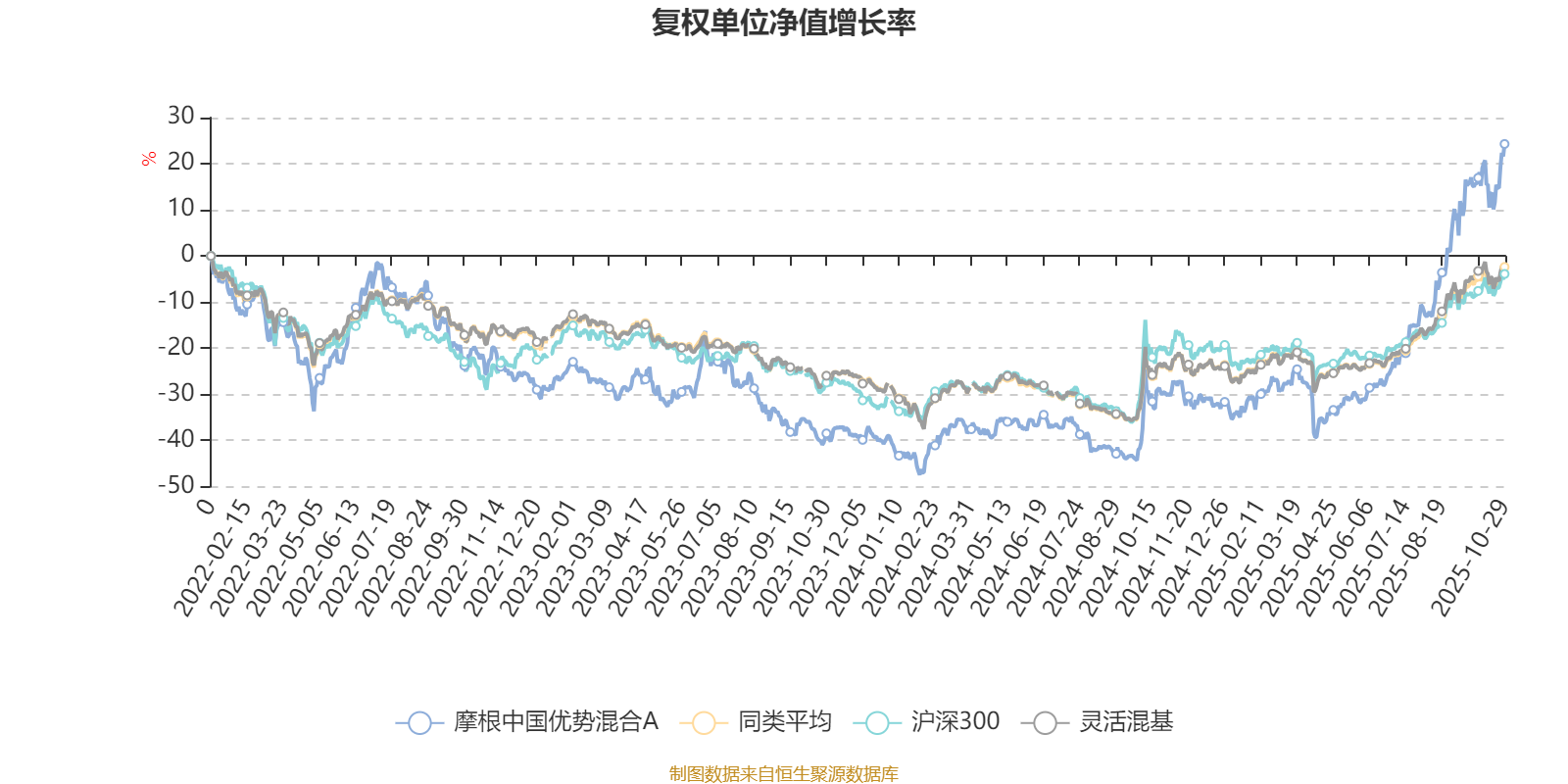 截至10月29日,摩根中国优势混合A近三个月复权单位净值增长率为38.96%,位于同类可比基金88/1287;近半年复权单位净值增长率为89.63%,位于同类可比基金31/1287;近一年复权单位净值增长率为77.56%,位于同类可比基金55/1287;近三年复权单位净值增长率为66.83%,位于同类可比基金88/1286。