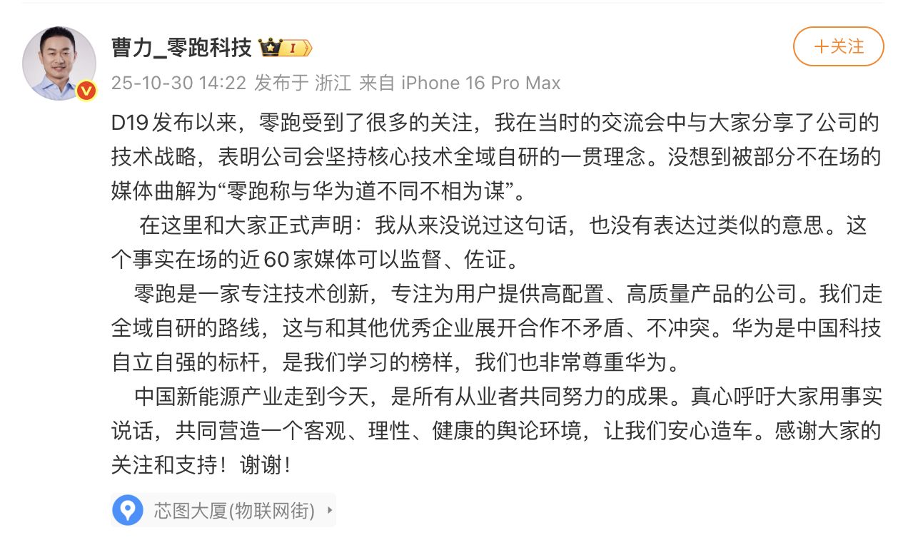 10月30日,针对“零跑称与华为道不同不相为谋”的说法,零跑汽车高级副总裁曹力在社交平台发布声明称,从来没说过这句话,也没有表达过类似的意思。