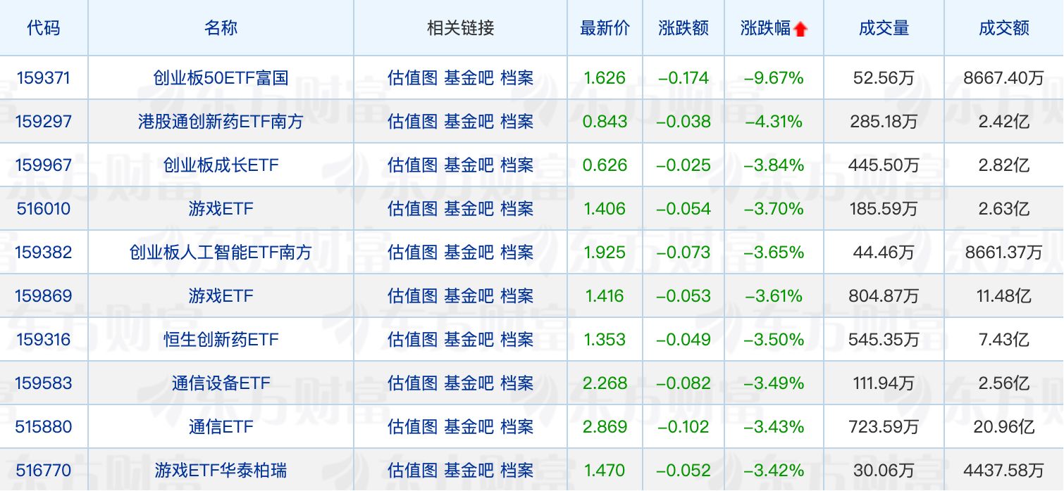 下跌方面,创业板50ETF富国领跌。游戏板块回调明显,巨人网络一度逼近跌停,多只游戏相关ETF也进入跌幅榜前列。
