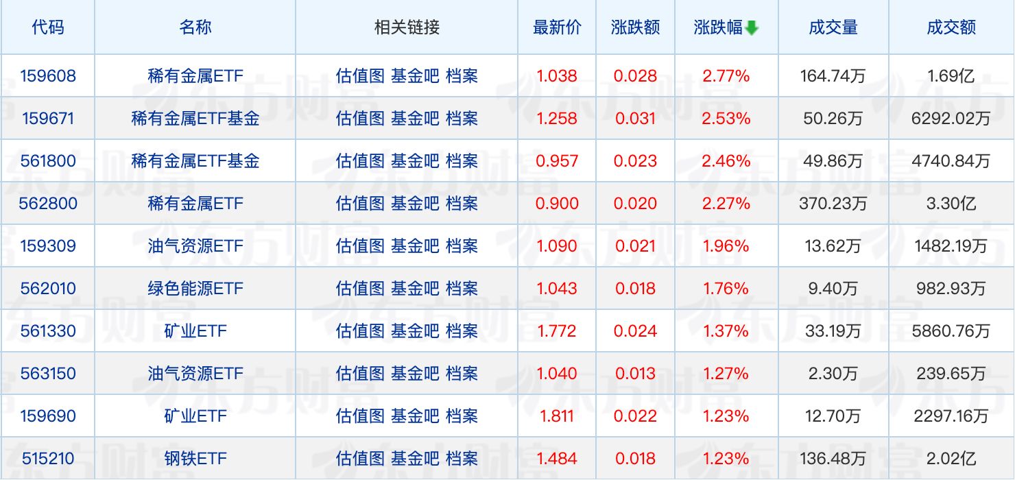 具体来看,稀有金属相关ETF集体走强,最高涨2.77%。