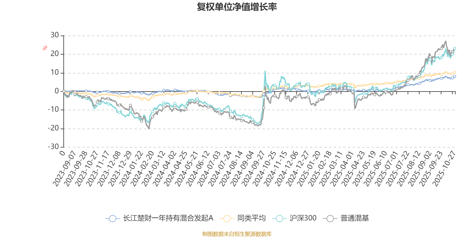 截至10月27日,长江楚财一年持有混合发起A近三个月复权单位净值增长率为4.37%,位于同类可比基金148/629;近半年复权单位净值增长率为7.54%,位于同类可比基金185/629;近一年复权单位净值增长率为6.59%,位于同类可比基金355/623。