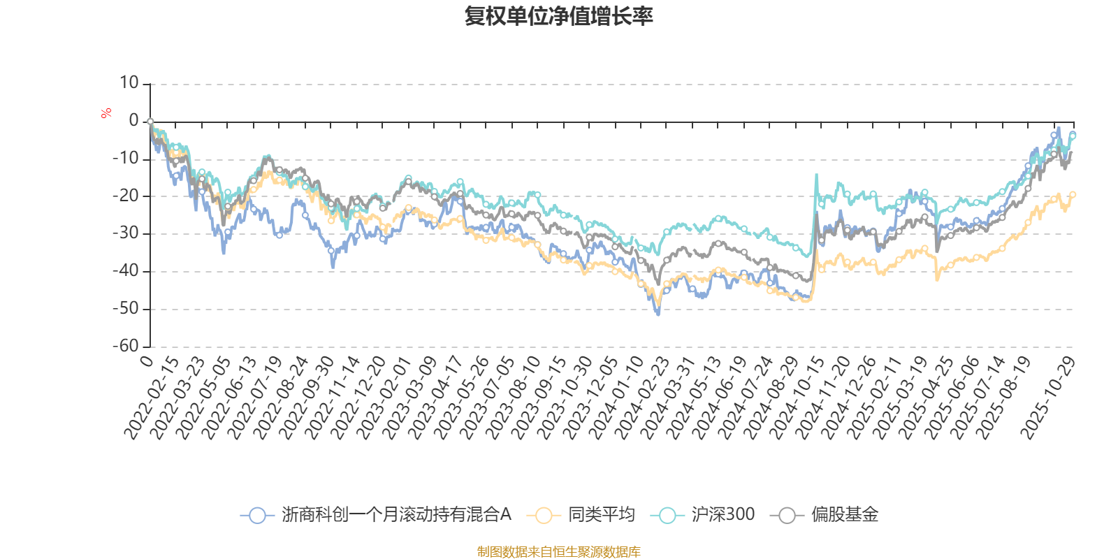 截至10月29日,浙商科创一个月滚动持有混合A近三个月复权单位净值增长率为16.73%,位于同类可比基金268/689;近半年复权单位净值增长率为34.28%,位于同类可比基金249/688;近一年复权单位净值增长率为35.33%,位于同类可比基金228/657;近三年复权单位净值增长率为48.63%,位于同类可比基金43/364。