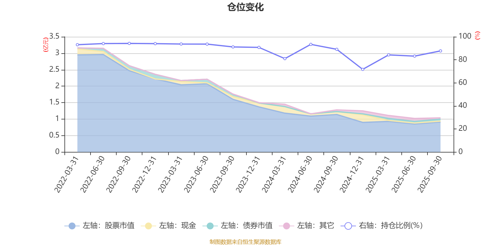 据定期报告数据统计,近三年平均股票仓位为87.81%,同类平均为83.73%。2022年三季度末基金达到94.24%的最高仓位,2024年末最低,为71.72%。