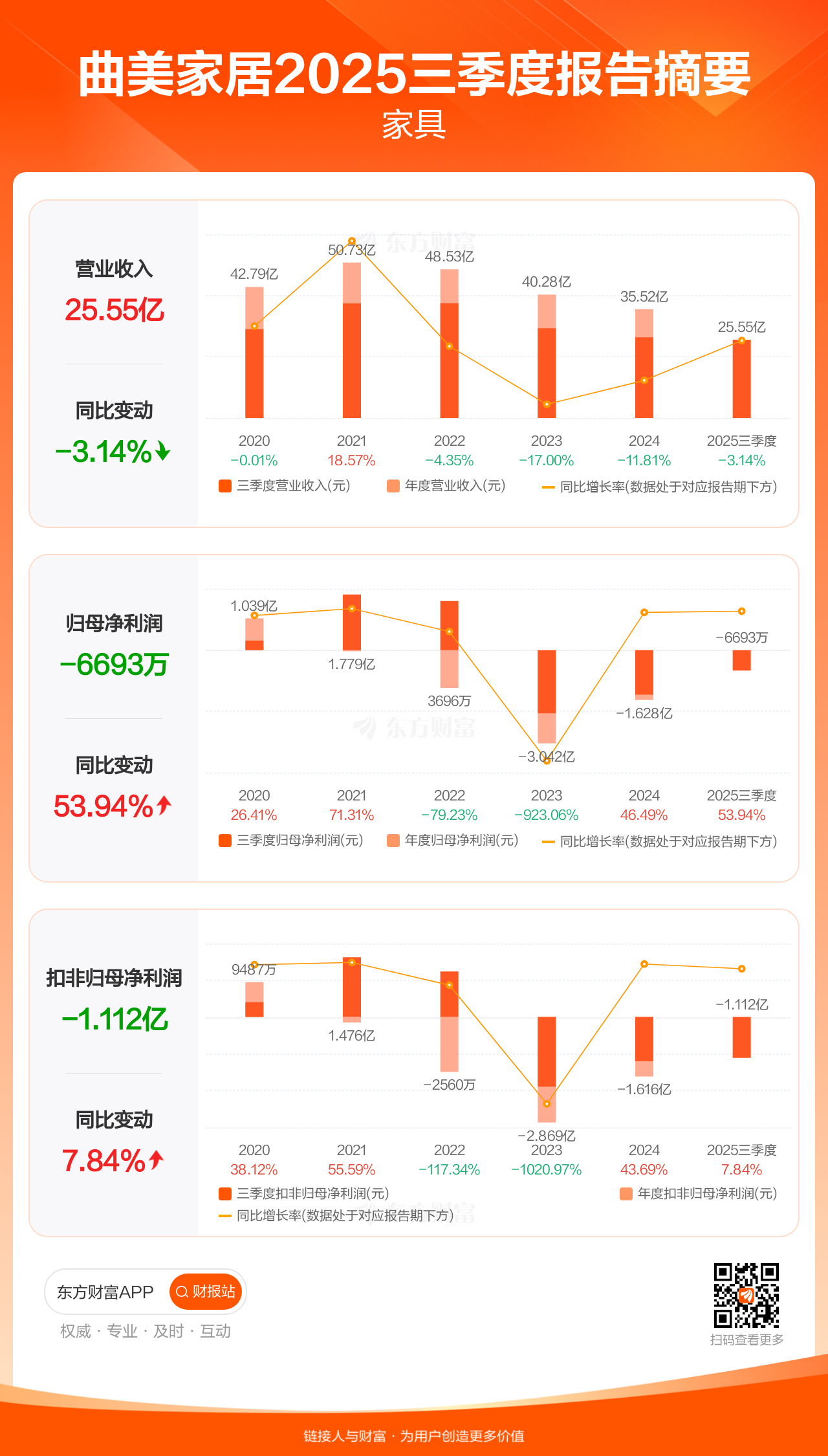 曲美家居10月31日发布2025年三季报显示,公司前三季实现营业收入25.55亿元,同比下滑3.14%;归母净利润-6693.36万元;扣非归母净利润-1.11亿元。