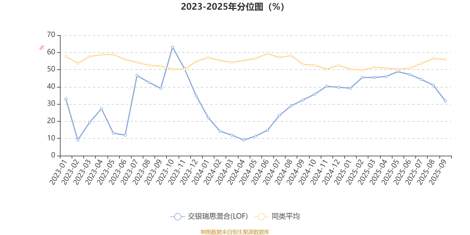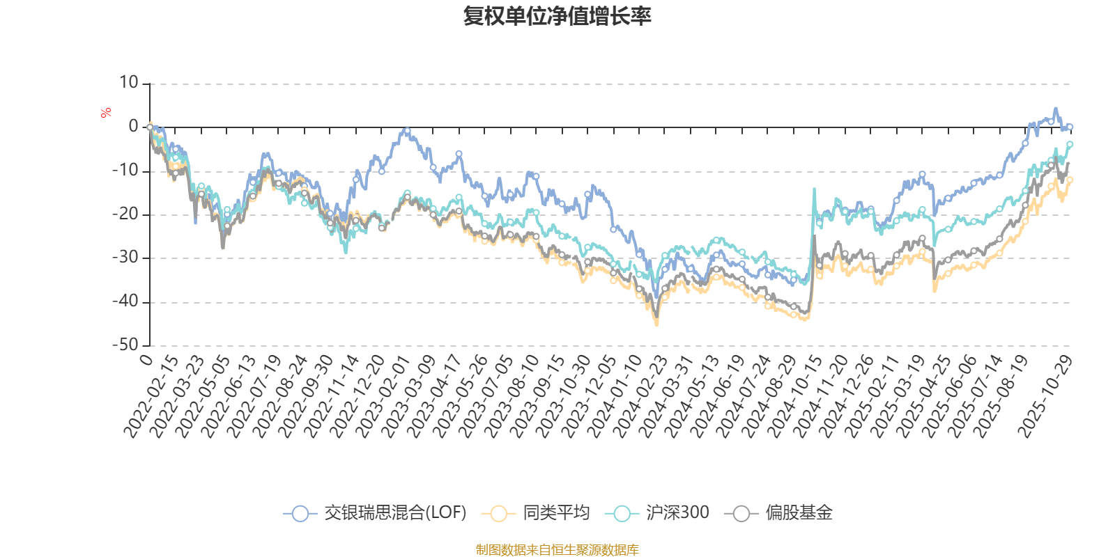 截至10月29日,交银瑞思混合(LOF)近三个月复权单位净值增长率为6.29%,位于同类可比基金149/185;近半年复权单位净值增长率为20.49%,位于同类可比基金138/185;近一年复权单位净值增长率为24.54%,位于同类可比基金112/181;近三年复权单位净值增长率为27.77%,位于同类可比基金73/175。