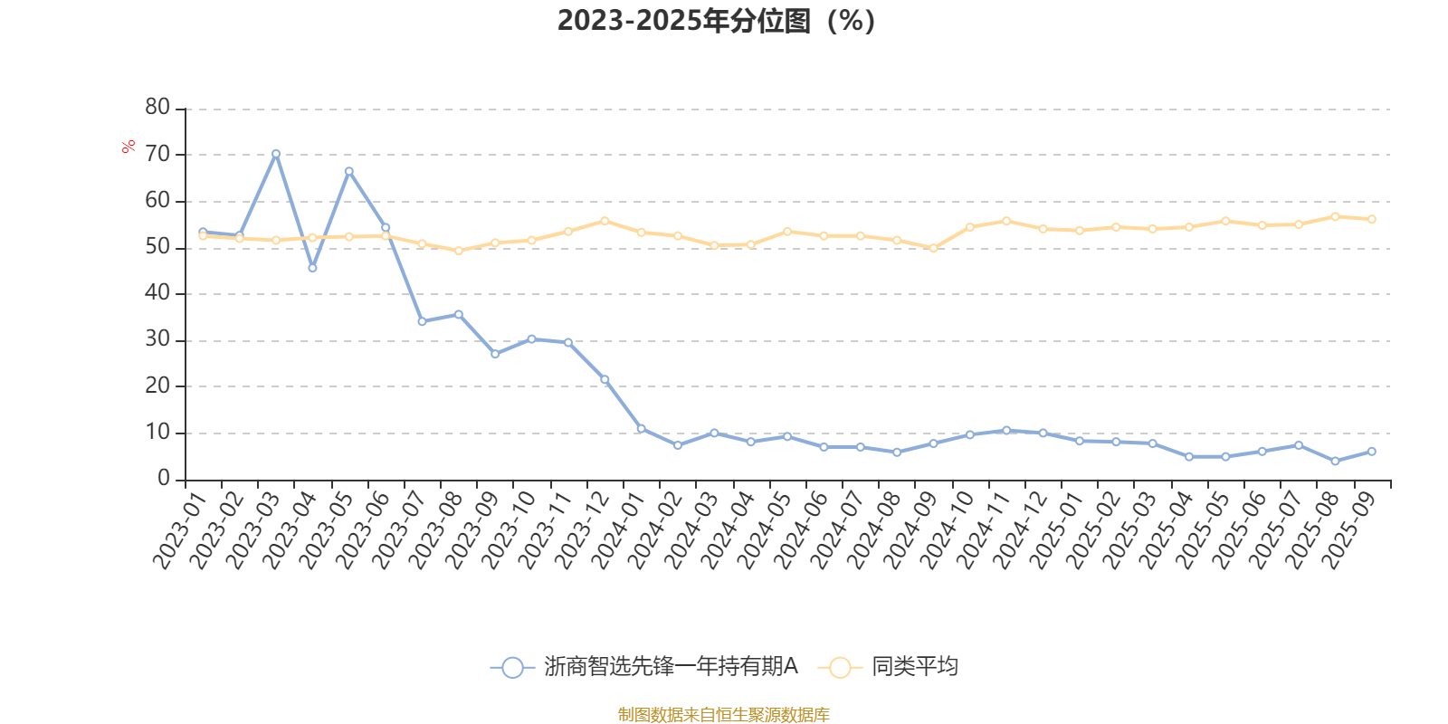 通过所选区间该基金净值增长率分位图,可以观察该基金与同类基金业绩比较情况。图为坐标原点到区间内某时点的净值增长率在同类基金中的分位数。