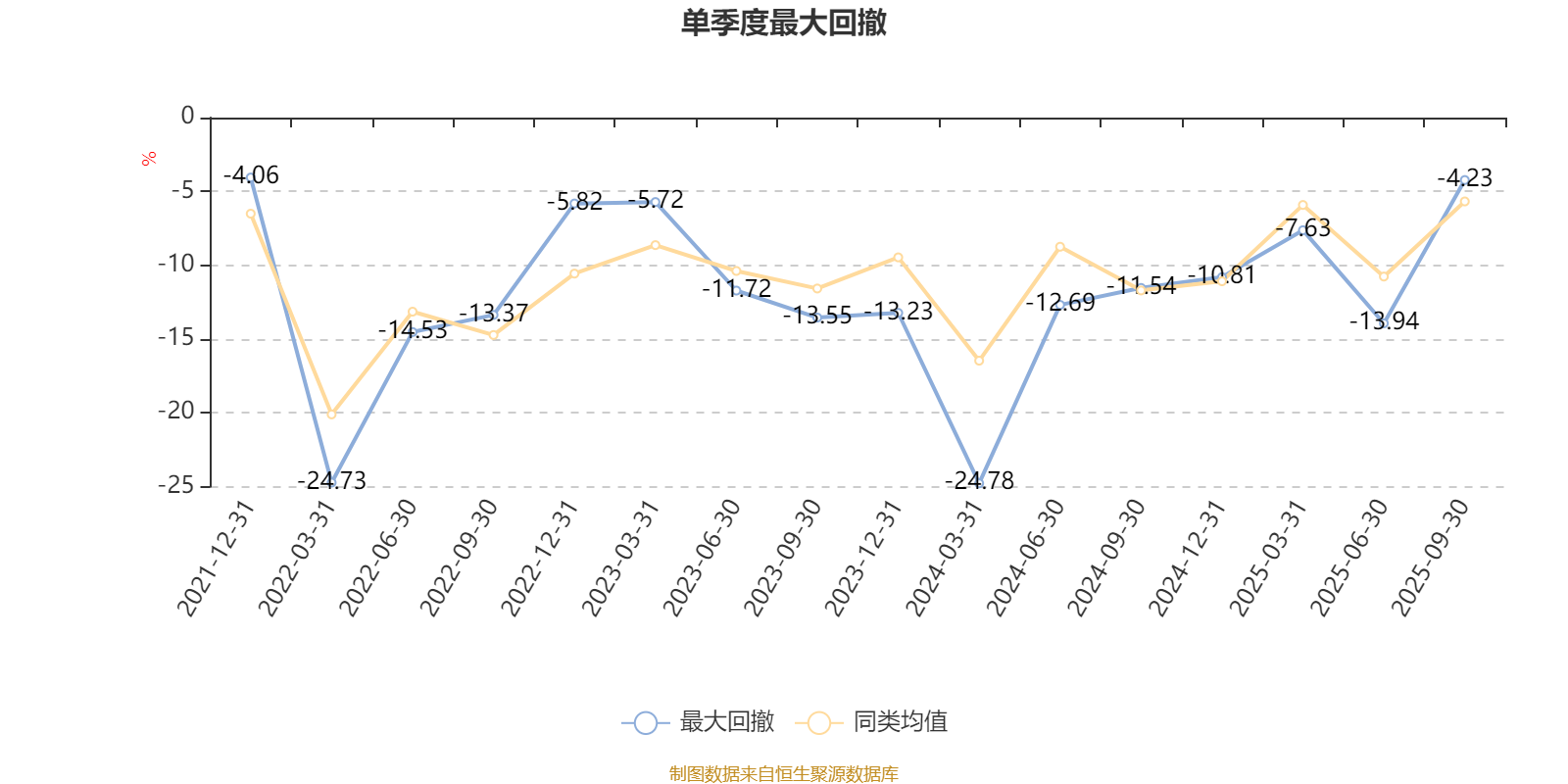 截至10月29日,基金近三年最大回撤为46.75%,同类可比基金排名459/513。单季度最大回撤出现在2024年一季度,为24.78%。