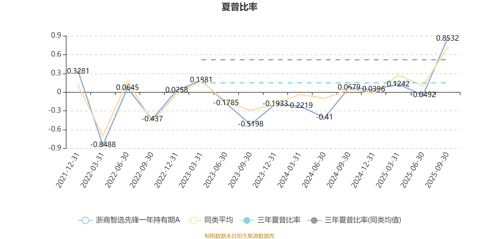 截至9月30日,基金近三年夏普比率为0.1483,位于同类可比基金457/518。