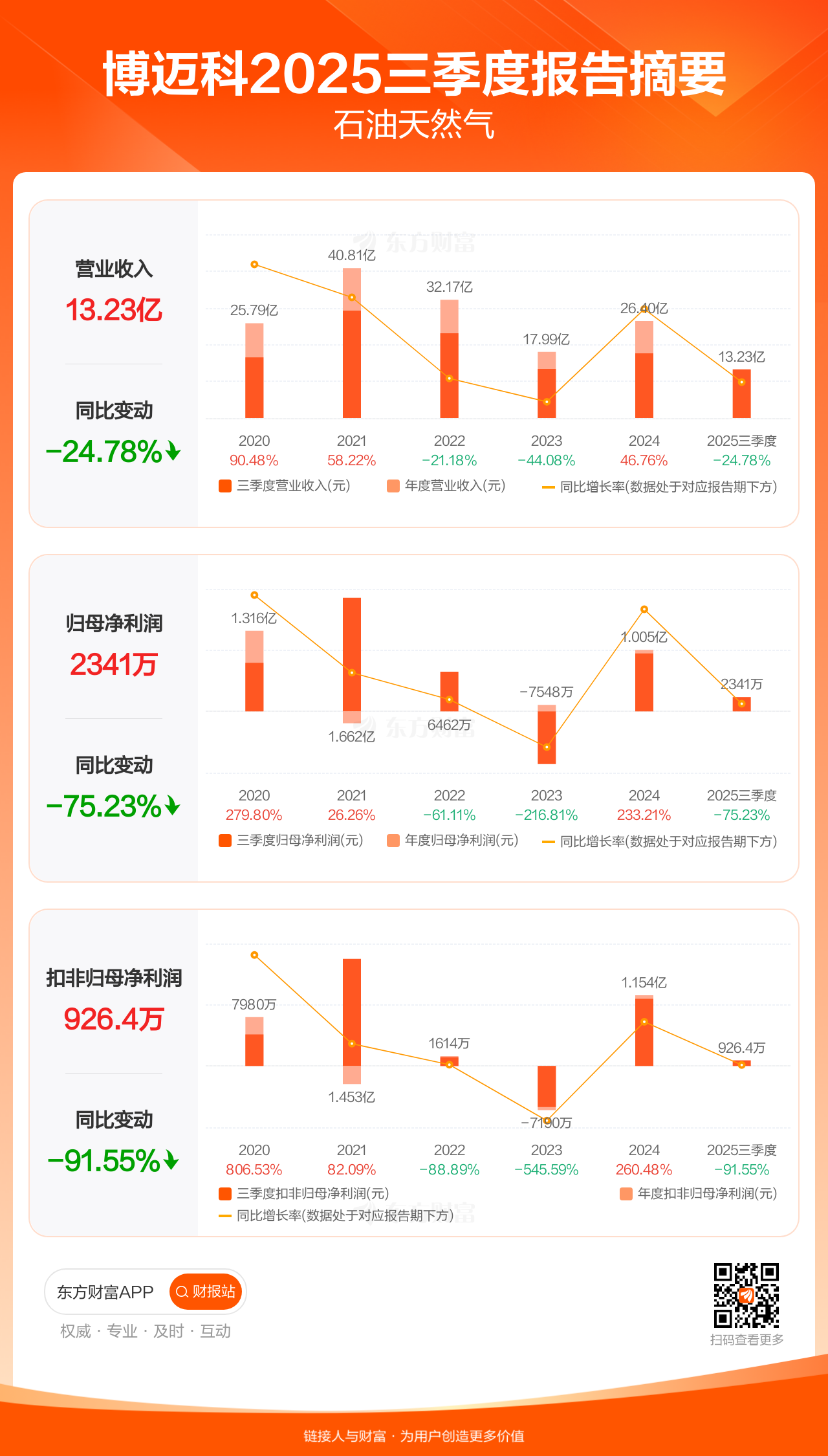 博迈科10月31日发布2025年三季报显示,公司前三季实现营业收入13.23亿元,同比下滑24.78%;归母净利润2340.96万元,同比下滑75.23%;扣非归母净利润926.40万元,同比下滑91.55%。