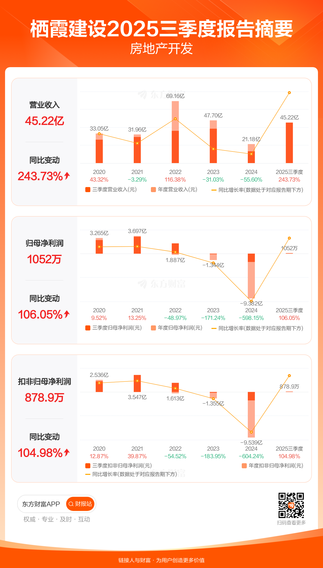 栖霞建设10月31日发布2025年三季报显示,公司前三季实现营业收入45.22亿元,同比增长243.73%;归母净利润1051.99万元,同比增长106.05%;扣非归母净利润878.94万元,同比增长104.98%。