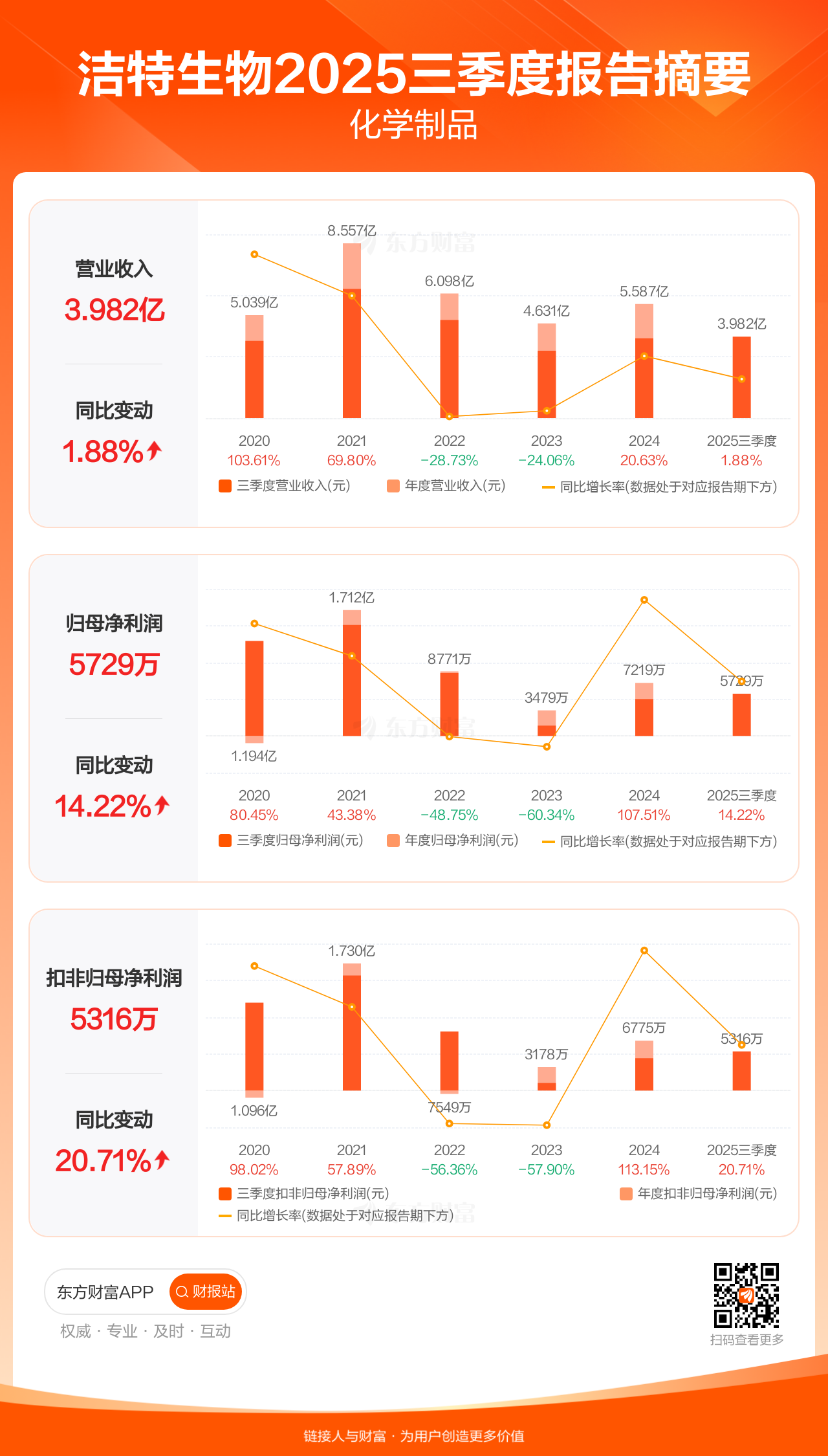 洁特生物10月31日发布2025年三季报显示,公司前三季实现营业收入3.98亿元,同比增长1.88%;归母净利润5729.13万元,同比增长14.22%;扣非归母净利润5316.32万元,同比增长20.71%。